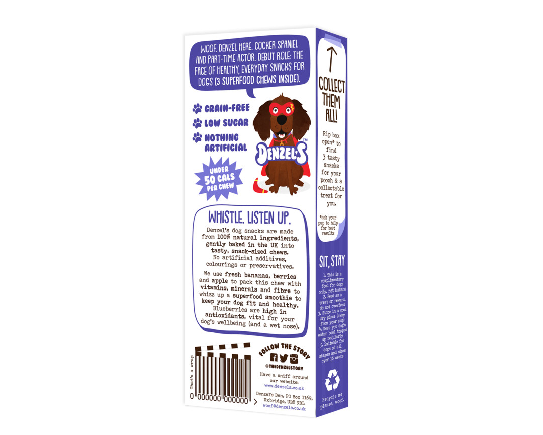Denzel's dog chew snacks are made from 100% natural ingredients, gently baked in the UK into tasty, snack-sized chews. Denzel's use fresh bananas, berries and apple to pack this chew with vitamins, minerals and fibre to whizz up a superfood smoothie to keep your dog fit and healthy. Blueberries are high in antioxidants, vital for your dog's wellbeing (and a wet nose).