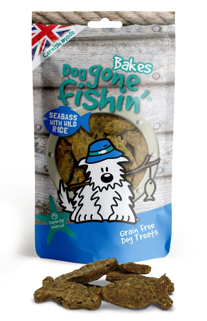 The Dog Gone Fishin' Seabass With Wild Rice Bakes are wholesome baked dog treats made with nutritious, human-grade Seabass and Wild Rice. A healthy low-calorie snack, reward or training treat for your dog. Dog Gone Fishin’ dog treats are GRAIN FREE, gentle on the stomach, easier to digest, a great source of protein and high in energy.