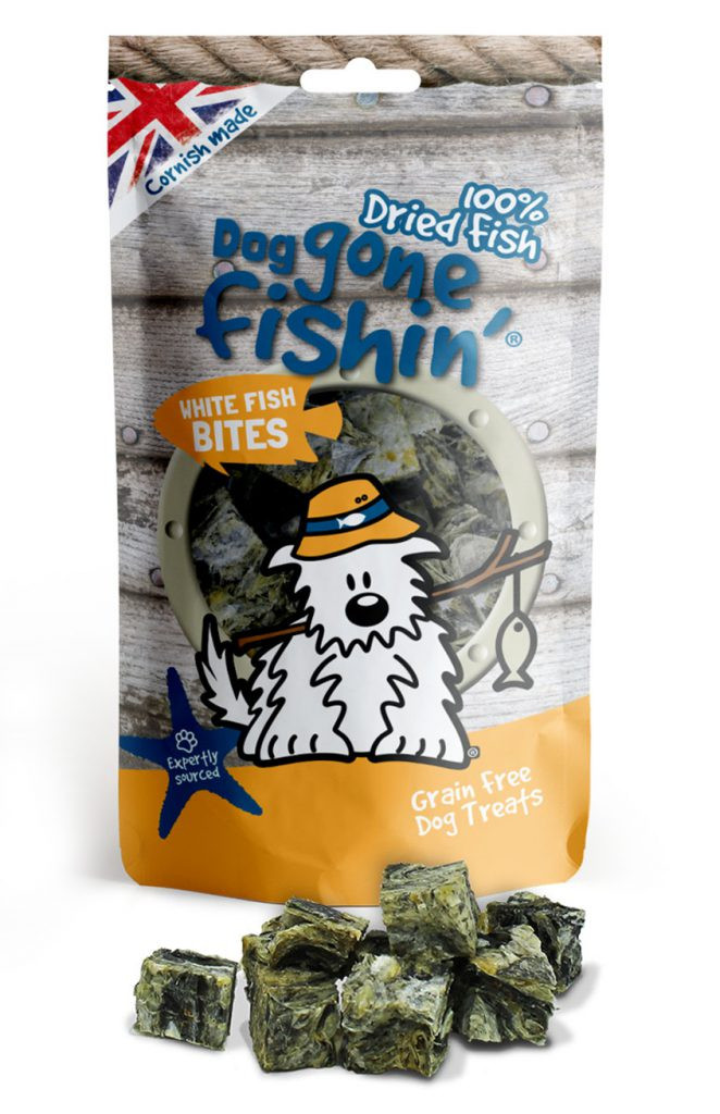 Dog Gone Fishin' White Fish Bites are 100% white fish skins. These Handy bite-sized pieces are air-dried to lock in all the goodness. This natural, healthy nutritious fish treat for your dog contains naturally occurring Omega 3. A healthy low-calorie snack, reward or training treat for your dog and a valuable supplement in a dog’s diet to support joint health. Dog Gone Fishin’ dog treats are GRAIN FREE, gentle on the stomach, easier to digest, a great source of protein and high in energy.