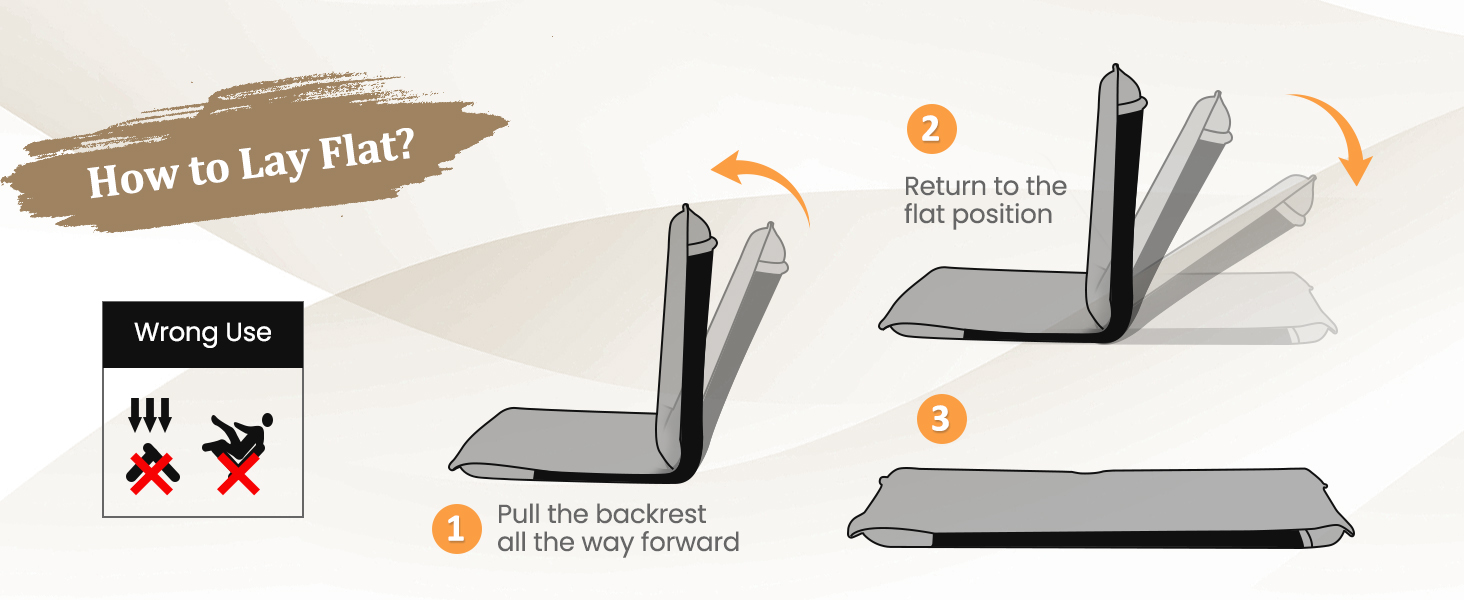 Flexible Adjustable Backrest: The backrest can be adjusted to 6 levels (between 90 °and 180 °). So you will always find the ideal position for you. You can even lay the floor chair down flat completely and then stow it away to save space.