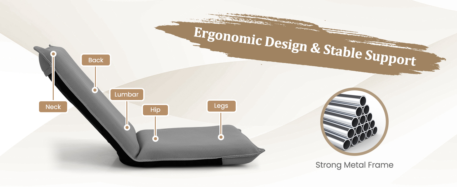 Good Material and Stable Structure: The floor chair is mainly made of high quality steel, foam, mesh, etc. The internal steel frame provides support and long service life. The fabric is wear-resistant and breathable. The floor chair can withstand a weight of 100 kg.