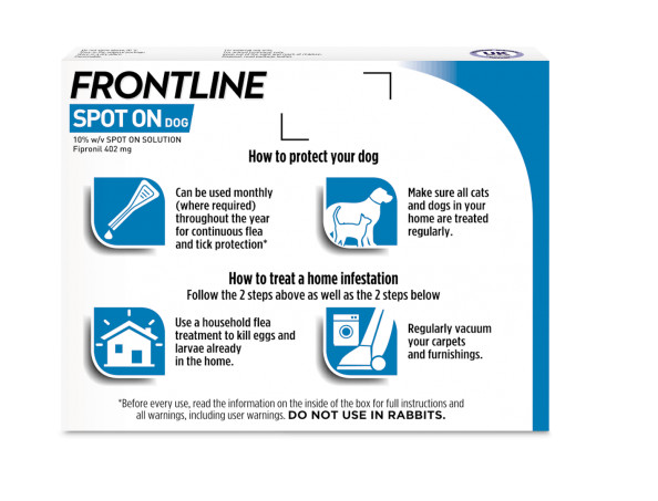 If your dog is unwell, please see your vet for advice before you apply a flea treatment. FRONTLINE Spot On dog is not suitable for use on rabbits.