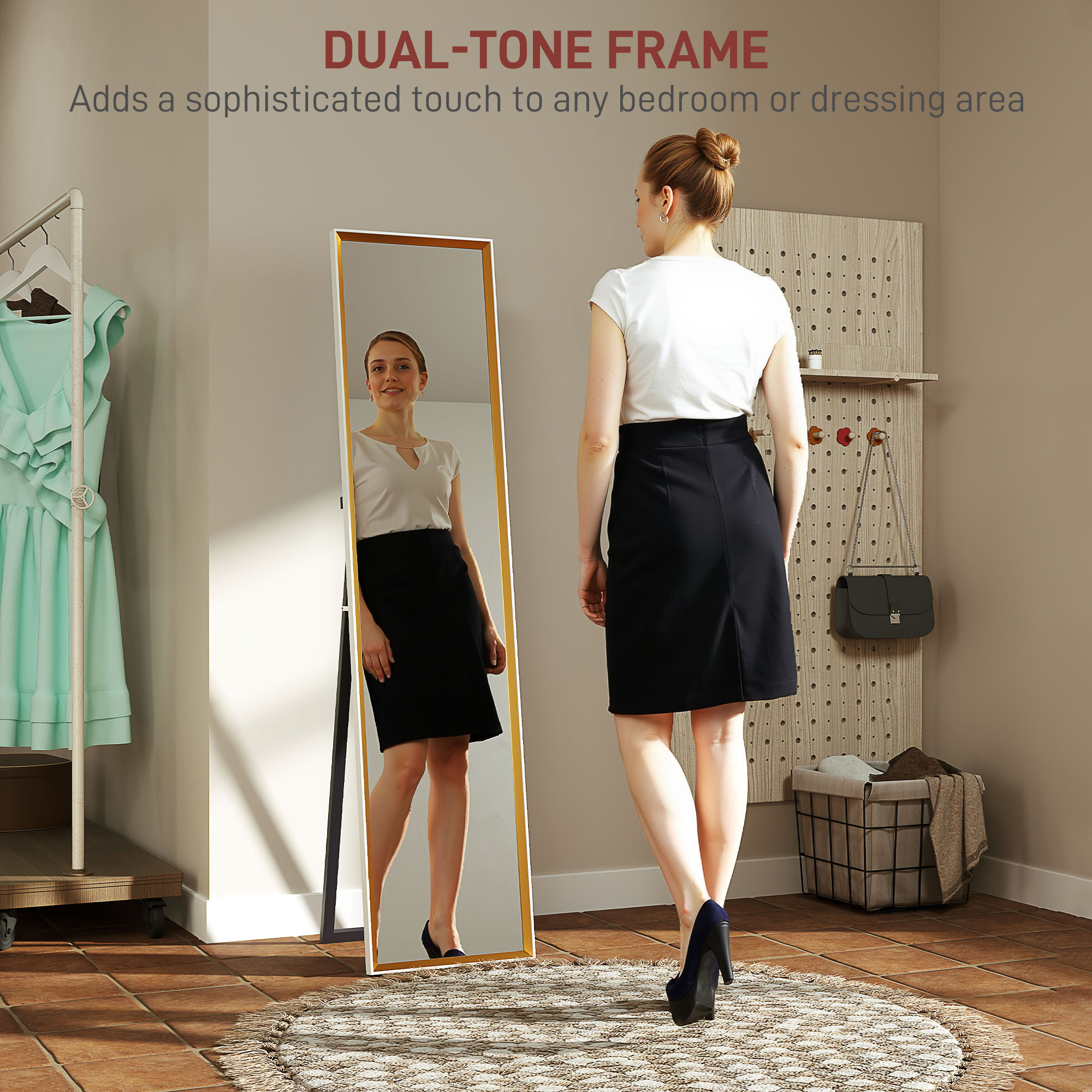 - Dual-tone elegance: The dual-colour MDF frame in white and gold tones elegantly complements any room decor, making this floor standing mirror both functional and decorative.