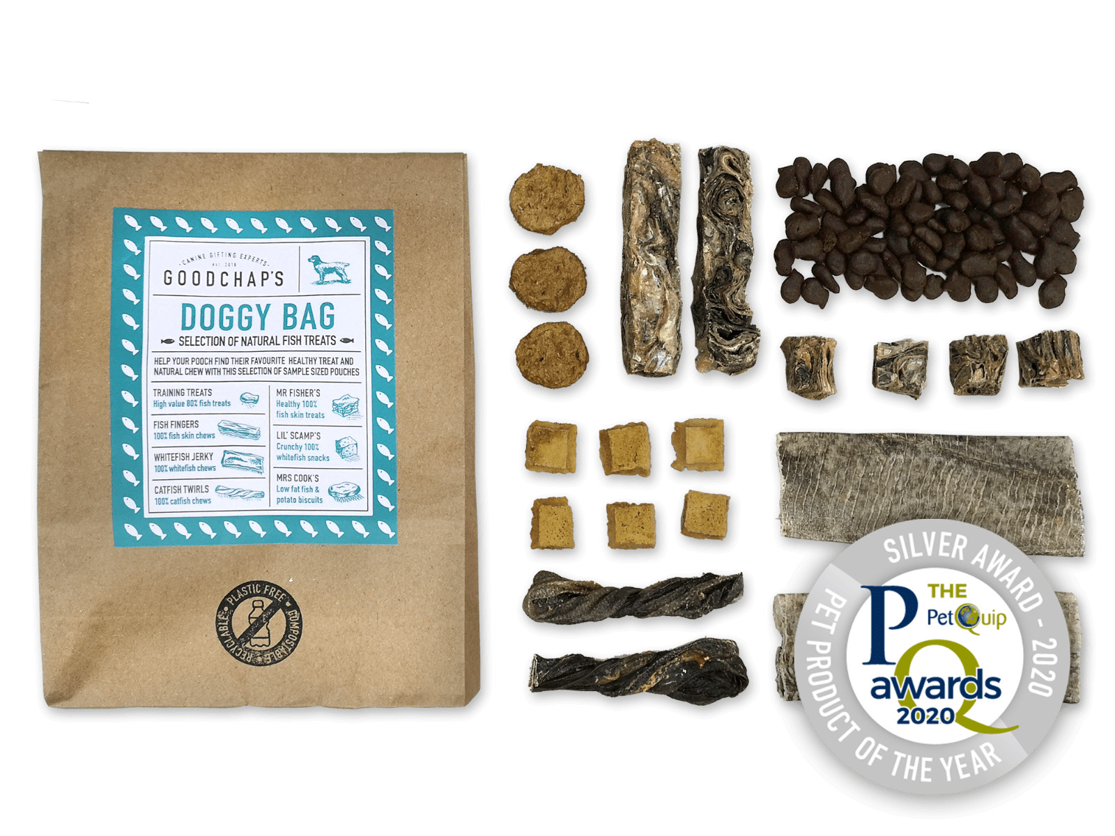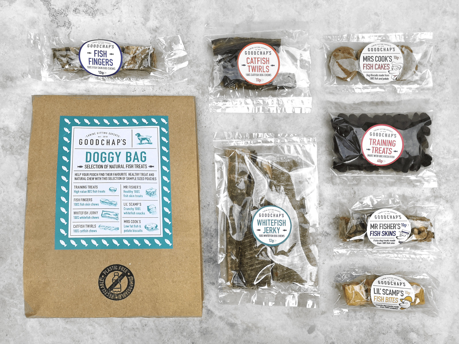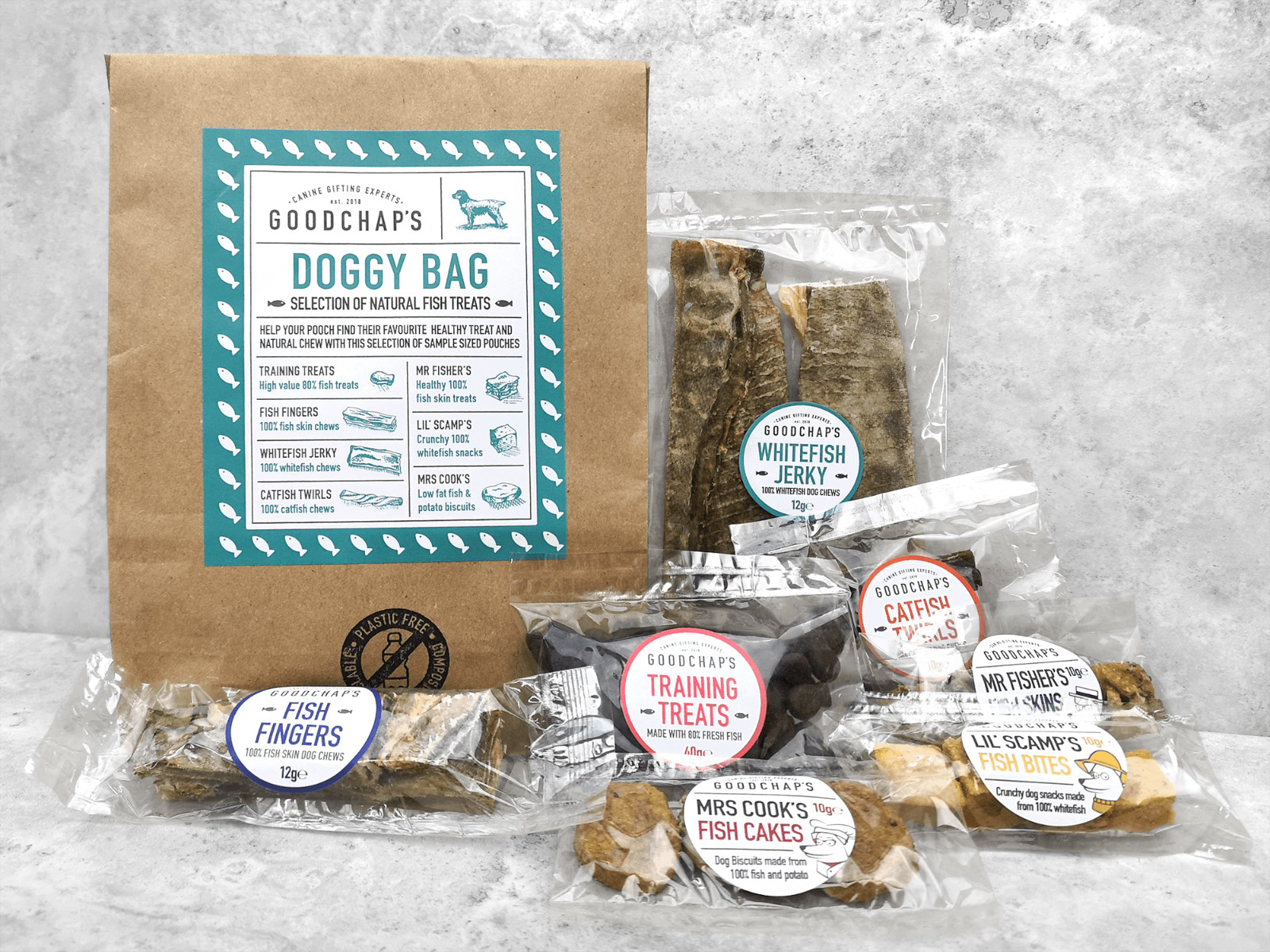A selection of our Fish treats in a handy gift bag. Filled with everything from our best-selling training treats to a selection of long-lasting chews, this bag of delights is guaranteed to get your dog’s tail wagging!
