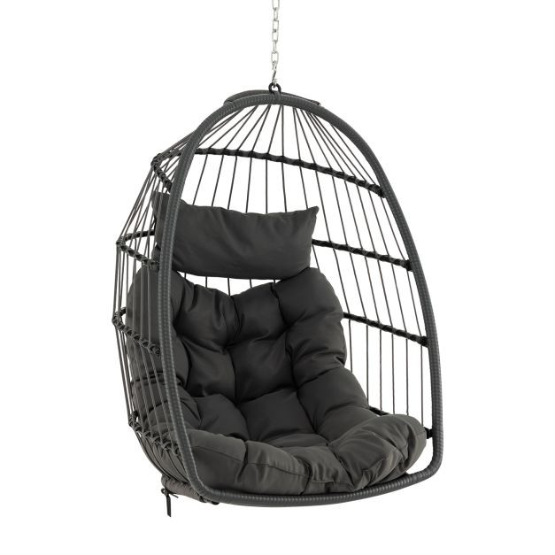Equipped with a seat cushion and headrest pillow, both of which are soft and elastic with high-density fillings, the egg chair will bring you endless coziness. Mainly made of premium PE rattan and heavy-duty metal, the swing chair features both elegance and stability. Moreover, it's quick-folding for more convenience, and it is easy to store in any corner of your room. The chair can be securely installed with the included expansion bolts for concrete ceilings, and the reinforced metal hanging chains and sturdy carabiner provide extra security. The 360° swiveling design also brings you more fun.