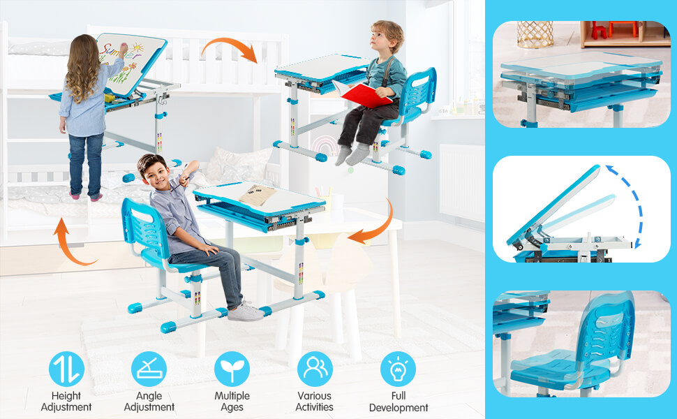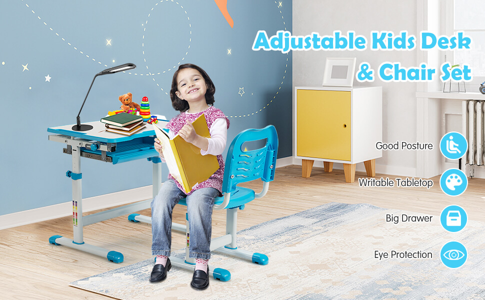 Height Adjustable Kids Study Table and Chair Set with Tilting Tabletop