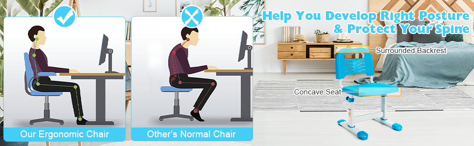 Ergonomic Design for Optimal Comfort: As the student’s chair is also adjustable, children can sit at the most appropriate position. What’s more, the ergonomic backrest can fit kids’ spine curve and help them cultivate good sitting posture. And the hollow-out backrest will contribute to heat dissipation and good ventilation for optimal comfort.