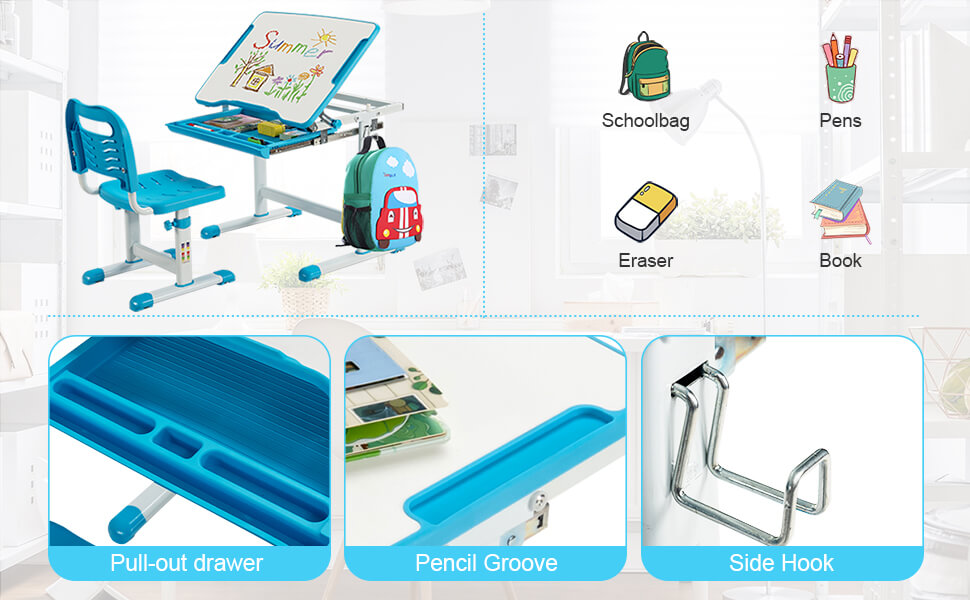Multifunctional Storage Space: Comes with a large pull-out drawer that has multiple grooves for various stationary and other school supplies, the writing desk can provide a tidy and clean surface for kids to focus on their schoolwork. And there is a metal hook aside the desk, which is sturdy enough for holding kids’ backpacks.