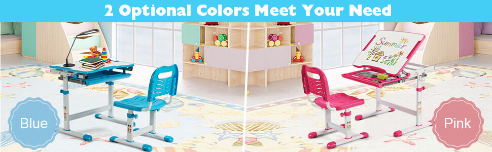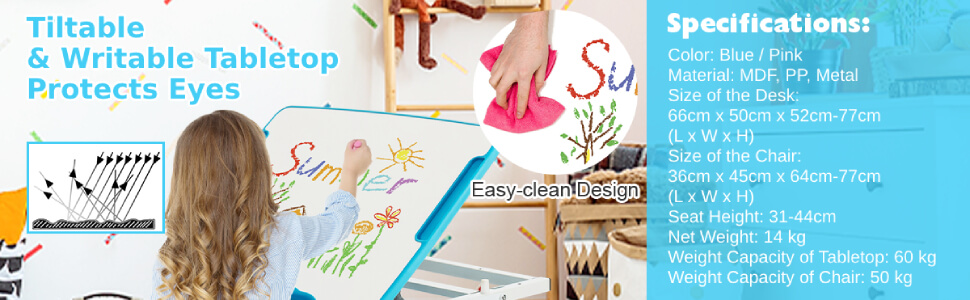 Tilting Table and Anti-pinch Design: In addition to height adjustment, the student’s desk also features a 0-45° tiltable desktop. Your little one can find a comfortable viewing angle for writing, reading or drawing. And there is an edge protection to hold the book or paper. Meanwhile, the anti-pinch clearance between the tabletop and frame can protect kids from accidental injuries.