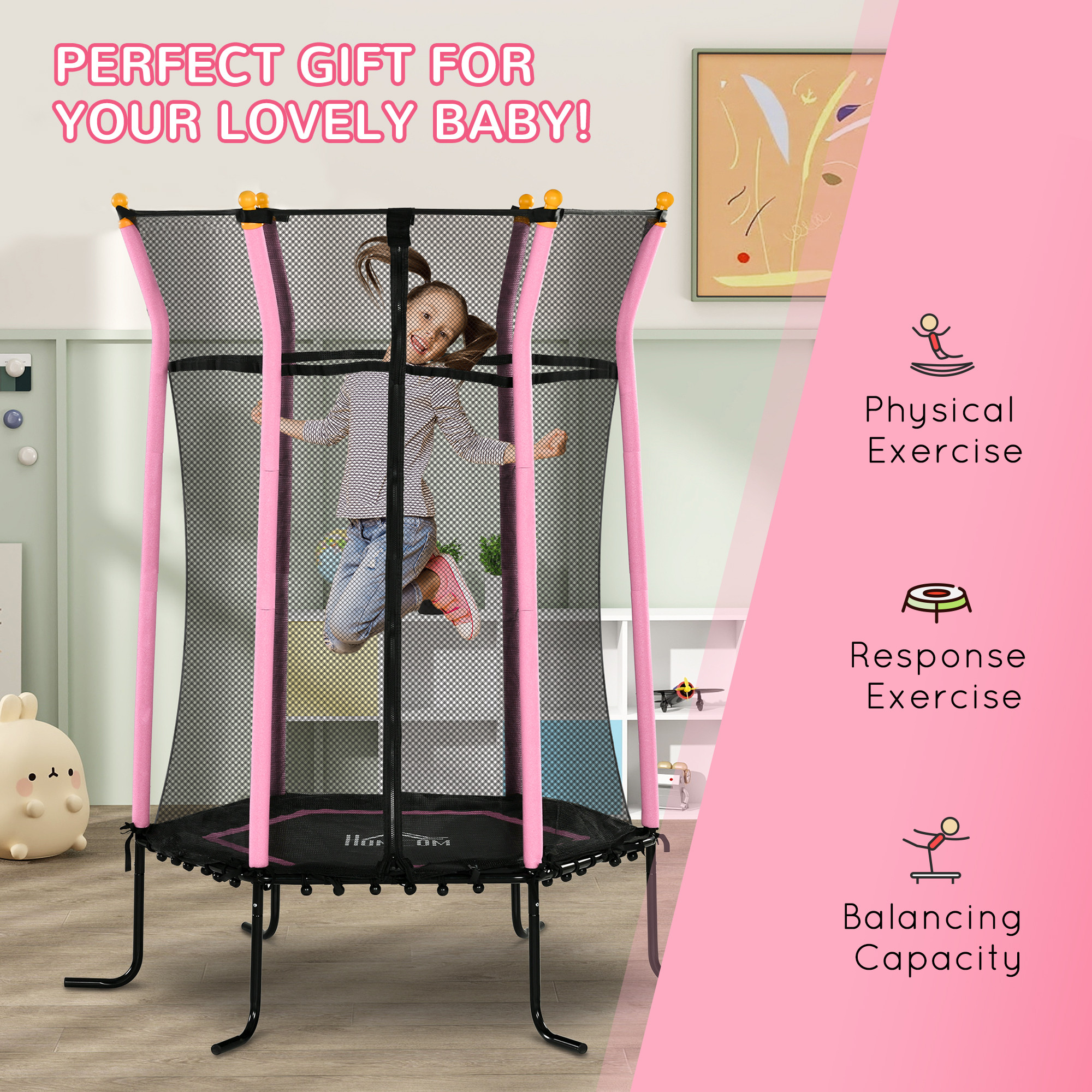 Kids Trampoline Mini Bouncer with Enclosure Safety Net For Ages 3-10 Years - Pink