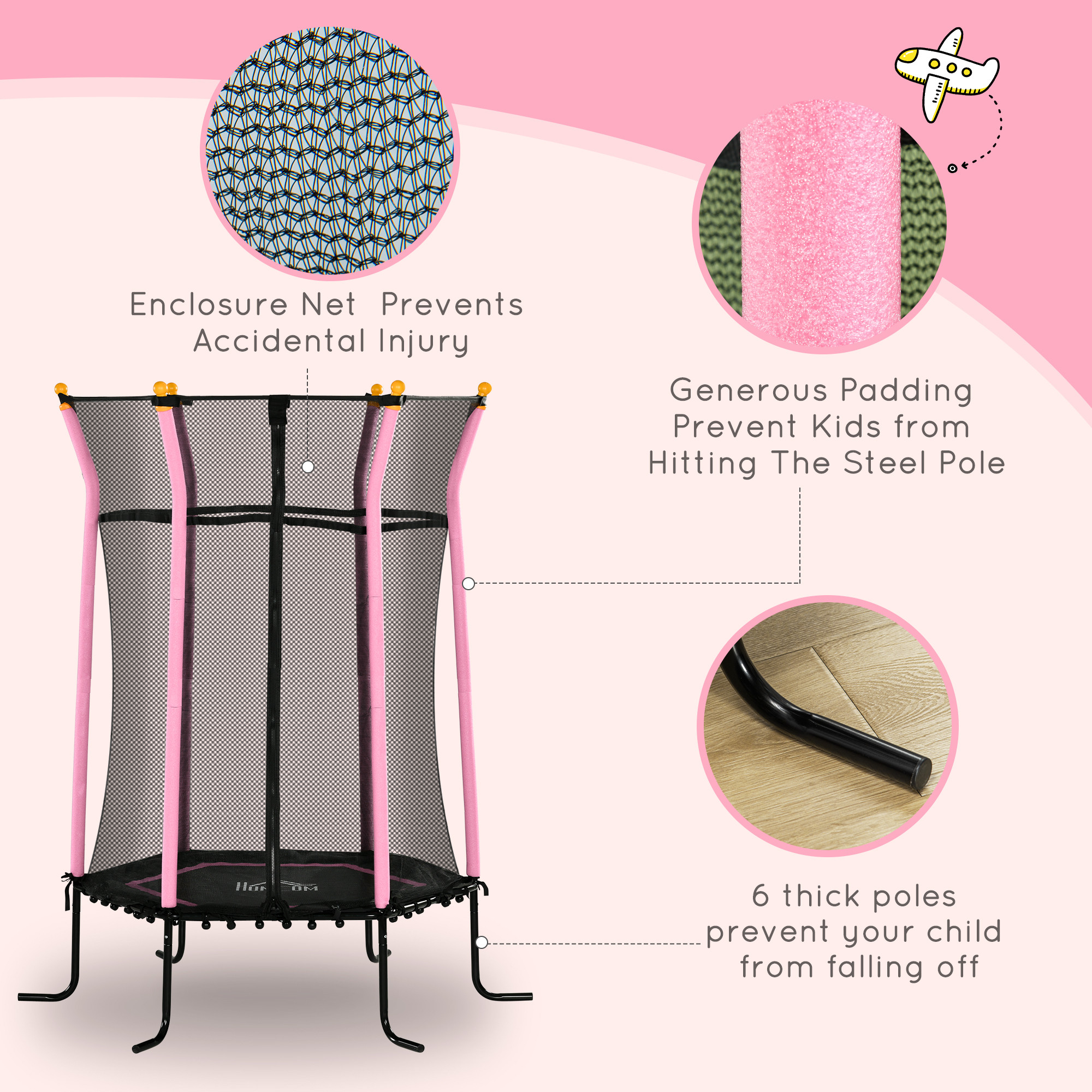 - Safe Play Area: Anti-UV net stops them from falling off. Thick padded poles to prevent accidents. A bungee design of the toddler trampoline instead of metal springs – reduces the risk of injury.