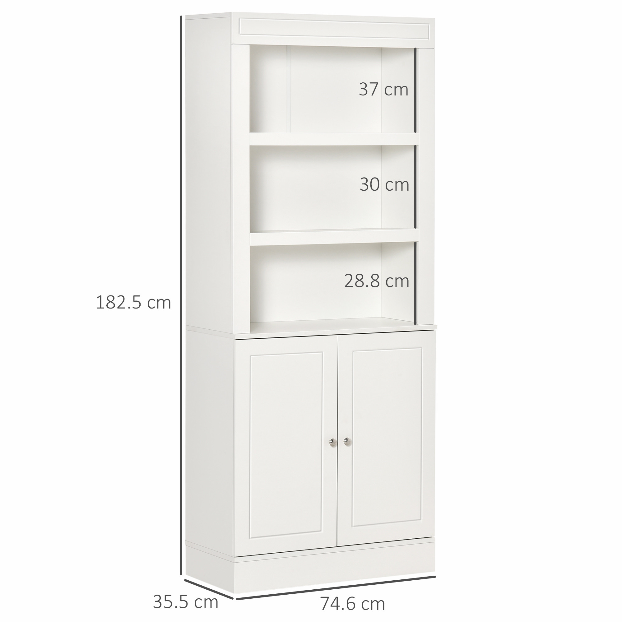 - DIMENSIONS: 182.5H x 74.6L x 35.5Wcm. Open shelves: 28.8H x 71.3W x 30Dcm, 30H x 71.3W x 30Dcm and 37H x 71.3W x 30Dcm. Cupboard shelves: 71W x 30.5Dcm.