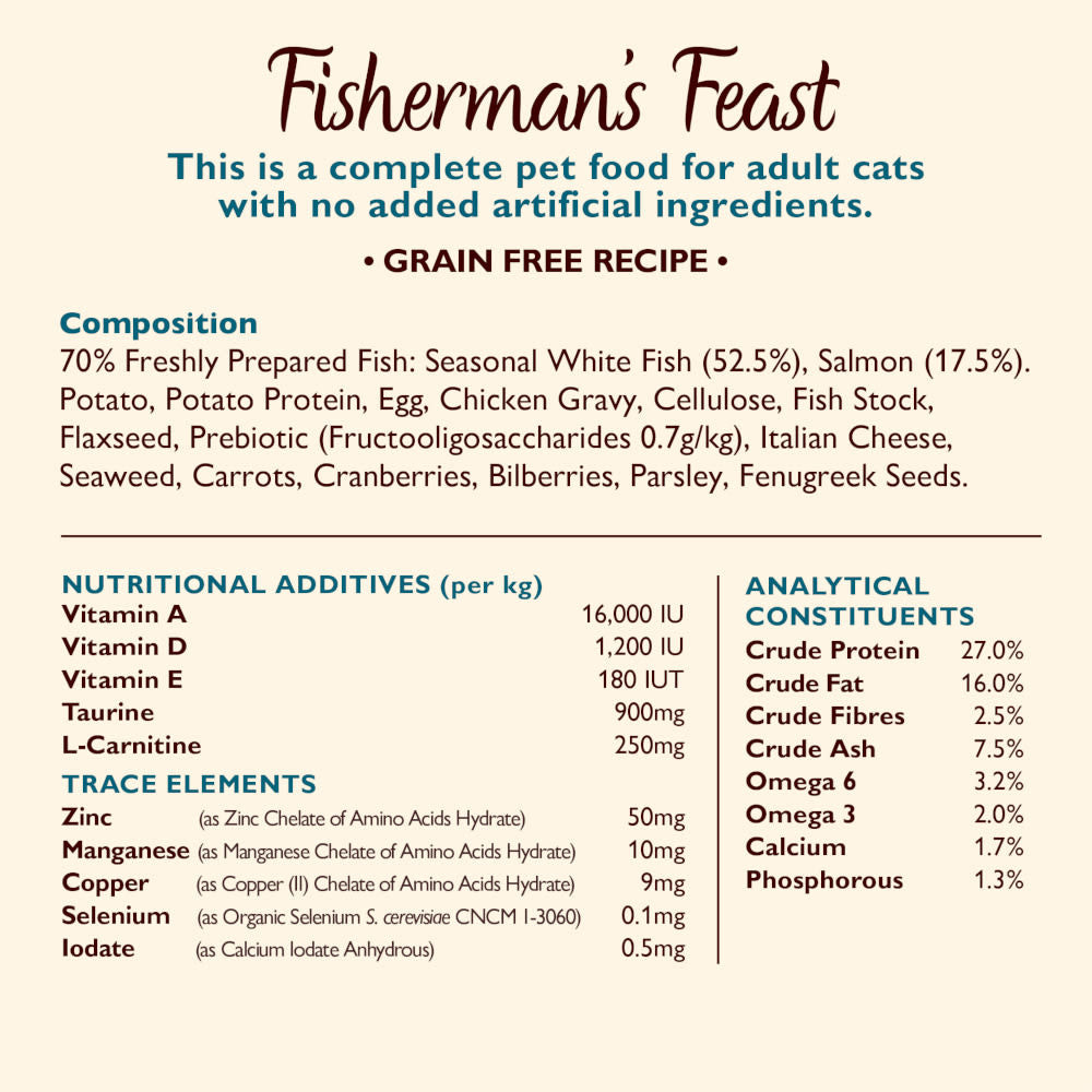 70% Freshly Prepared Fish: Seasonal White Fish (52.5%), Salmon (17.5%)