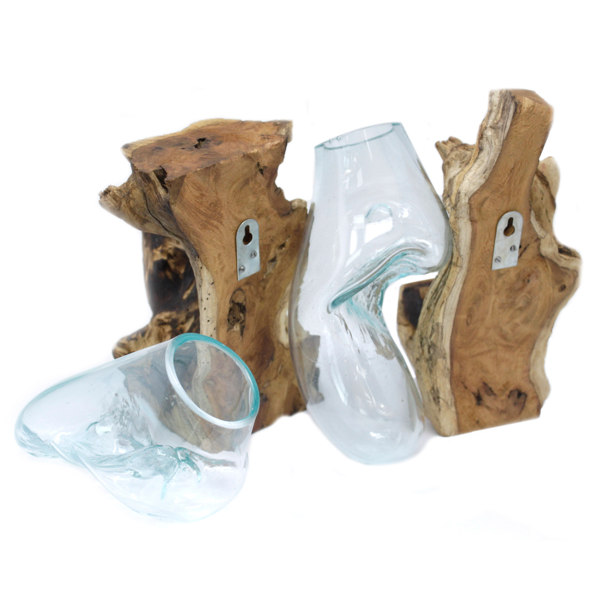 The glass is hand-blown and while still hot it is then relaxed over a piece of Gamal root, the glass then hardens to the shape of the wood ensuring a perfect fit. They are crafted using a natural product by using hand tools in the traditional Balinese way. It provides a one-of-a-kind setting for stones and air plants, cut flowers or a wine decanter.