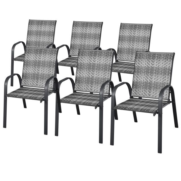 There are 6 chairs in total that are ideal for family gatherings or friend parties. The weather-resistant machine woven PE rattan is selected for more accent outlook, higher density and longer use. At the same time, the steel frame is powder coated for rustproof, which ensures high durability for outdoor use. The reinforced bar and the non-slip foot pads brings strong stability. There are wide and deep backrests and seats as well as smoothly curved armrests for resting your back, spine and arms. Additionally, this patio dining chair set has an elegant appearance that matches many places well. After finishing outdoor gatherings, you can stack them together for space-saving.