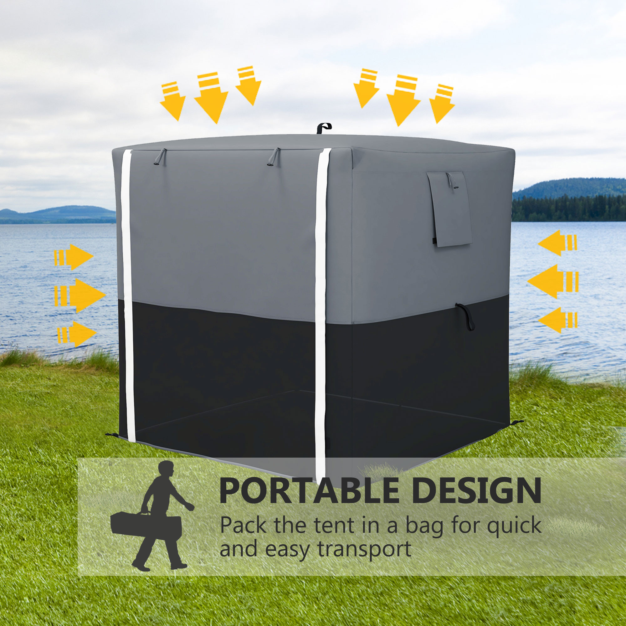 - Dimensions: 200H x 180L x 180Wcm. Eave: 178Hcm. Fits 2-3 people.