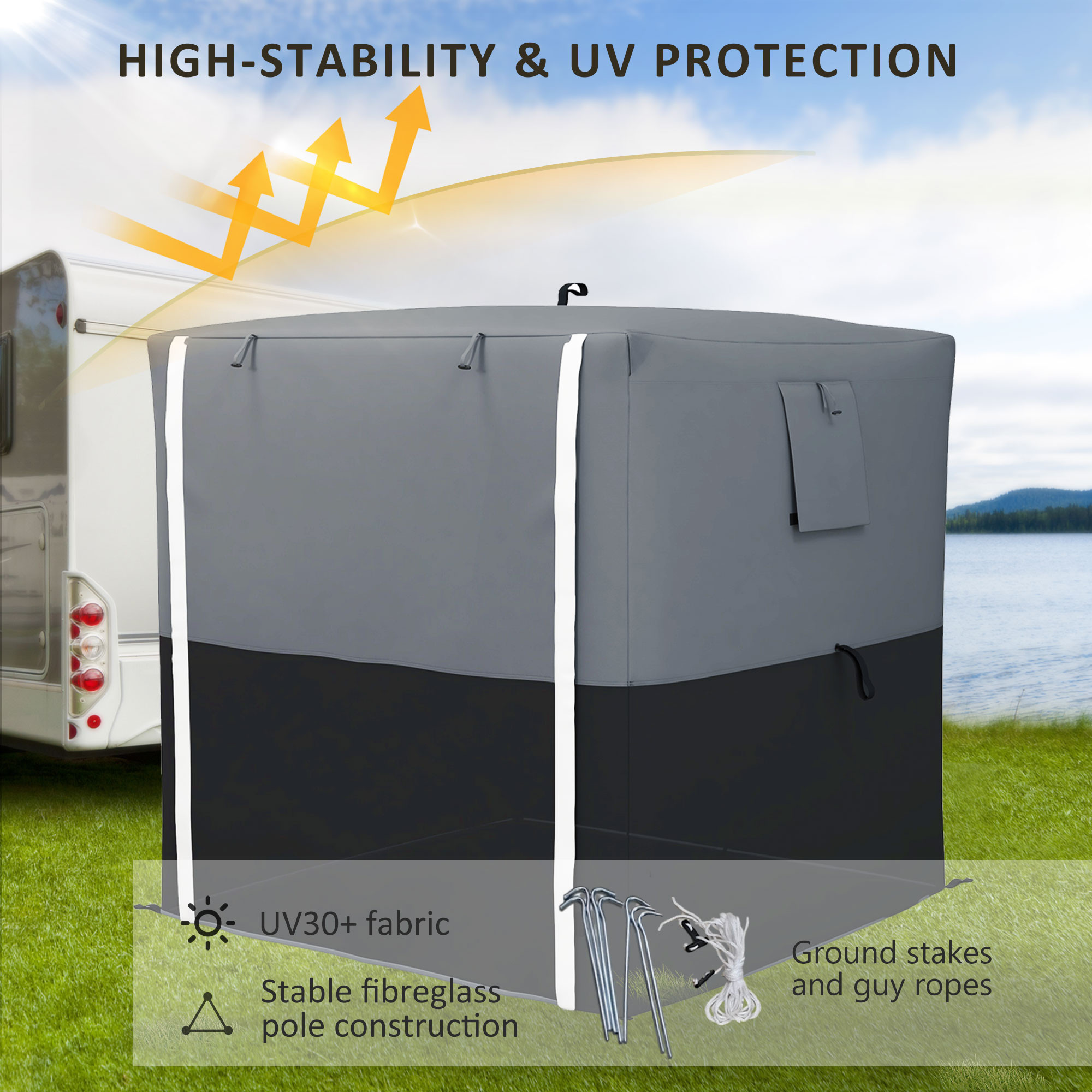 - Fibreglass structure, with UV 30+ fabric shell: A long-lasting and outdoor-suitable event shelter. Long-lasting core which stands steady.