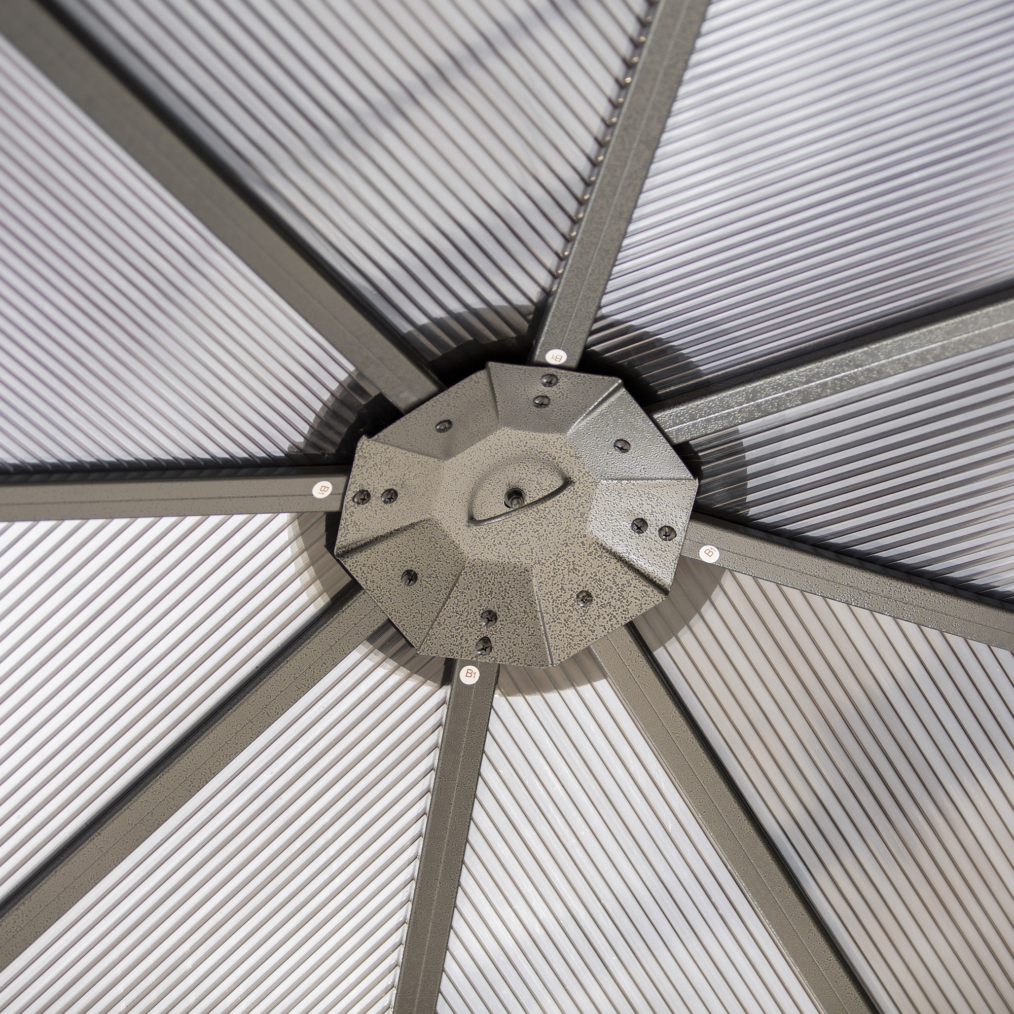 - STURDY ROOF: The hard top gazebo's roof is made with 6mm brown polycarbonate for stability, which is UV and water resistant to protect from harmful UV rays or light rain. The pointed roof design allows rainwater to flow down from the top to prevent water accumulation.