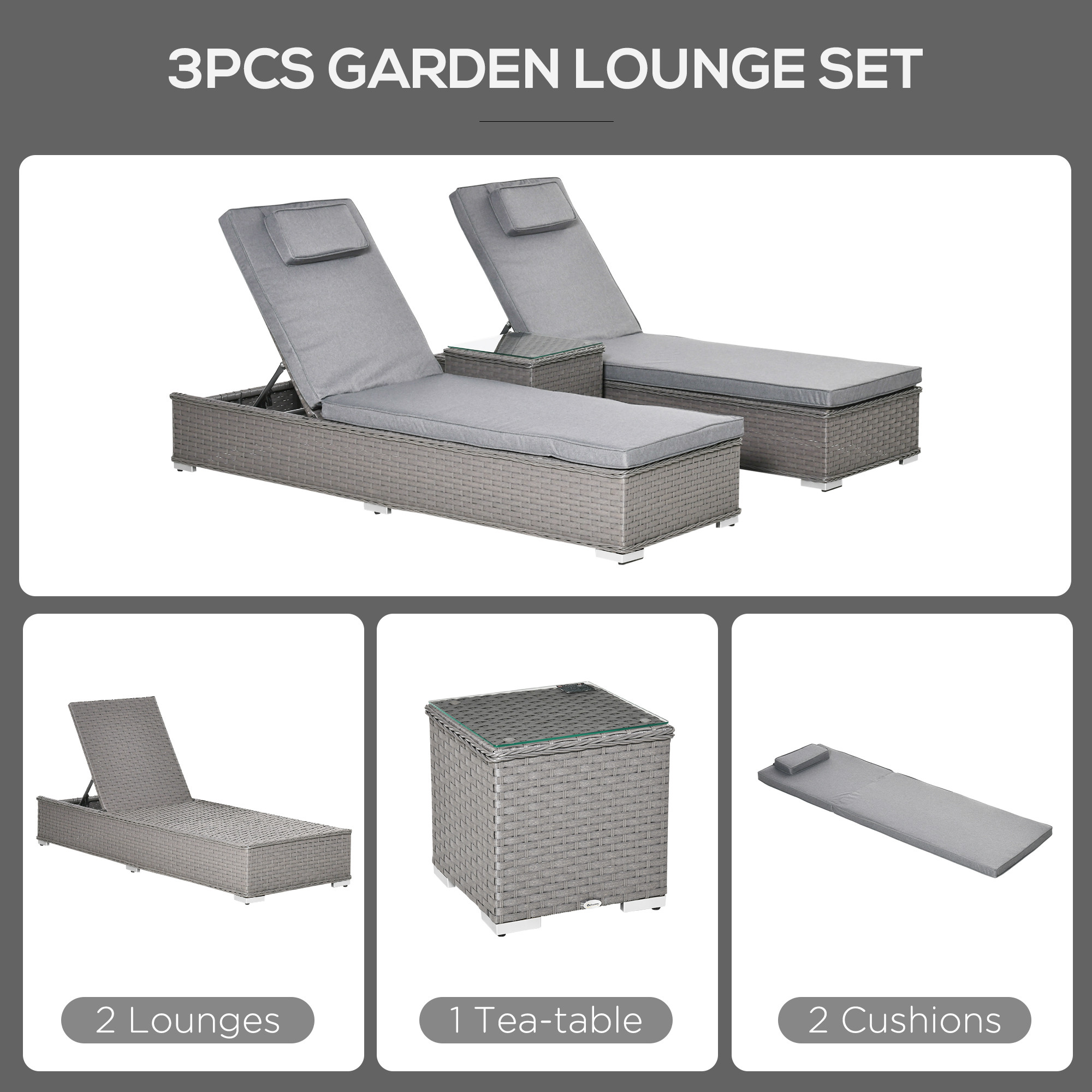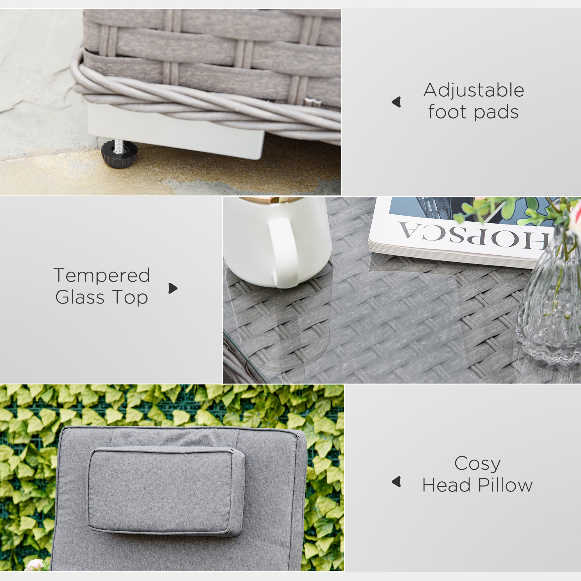 Outsunny 3PC Rattan Sun Lounger, Garden Furniture with Side Table, 5-Position Adjustable Recline Chair, Grey