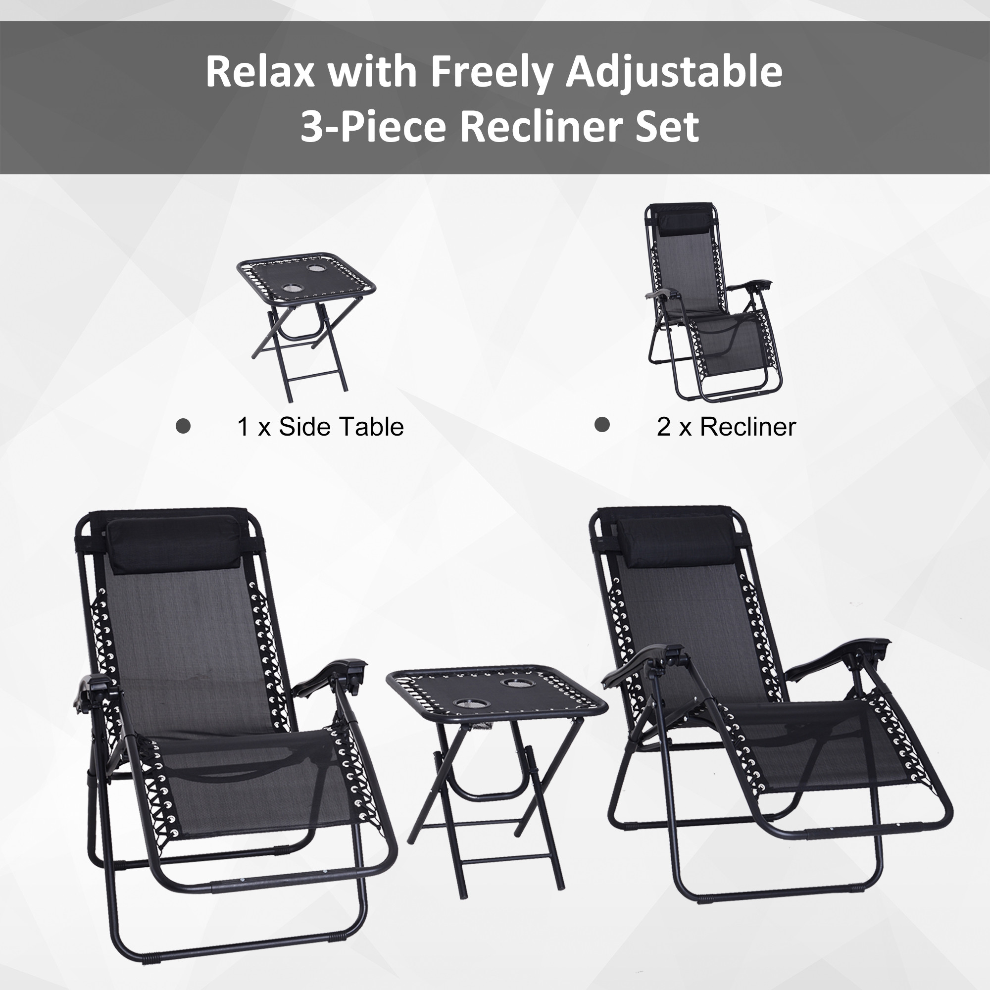 Outsunny 3pcs Folding Zero Gravity Chairs Sun Lounger Table Set w/ Cup Holders Reclining Garden Yard Pool, Black