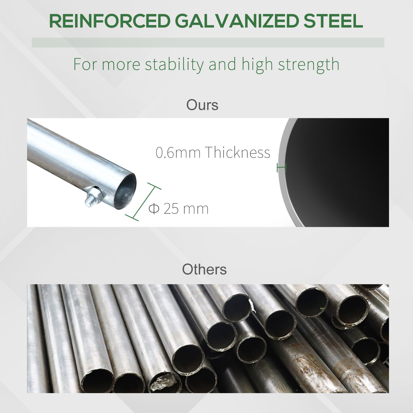 - HEAVY-DUTY STEEL FRAME: This large greenhouse is constructed with a heavy duty galvanised steel frame in stable build, resistant to rust, corrosion, chipping and peeling. 2 extra supporting rods to add this polytunnel large stability and make the greenhouse tunnel more stable.