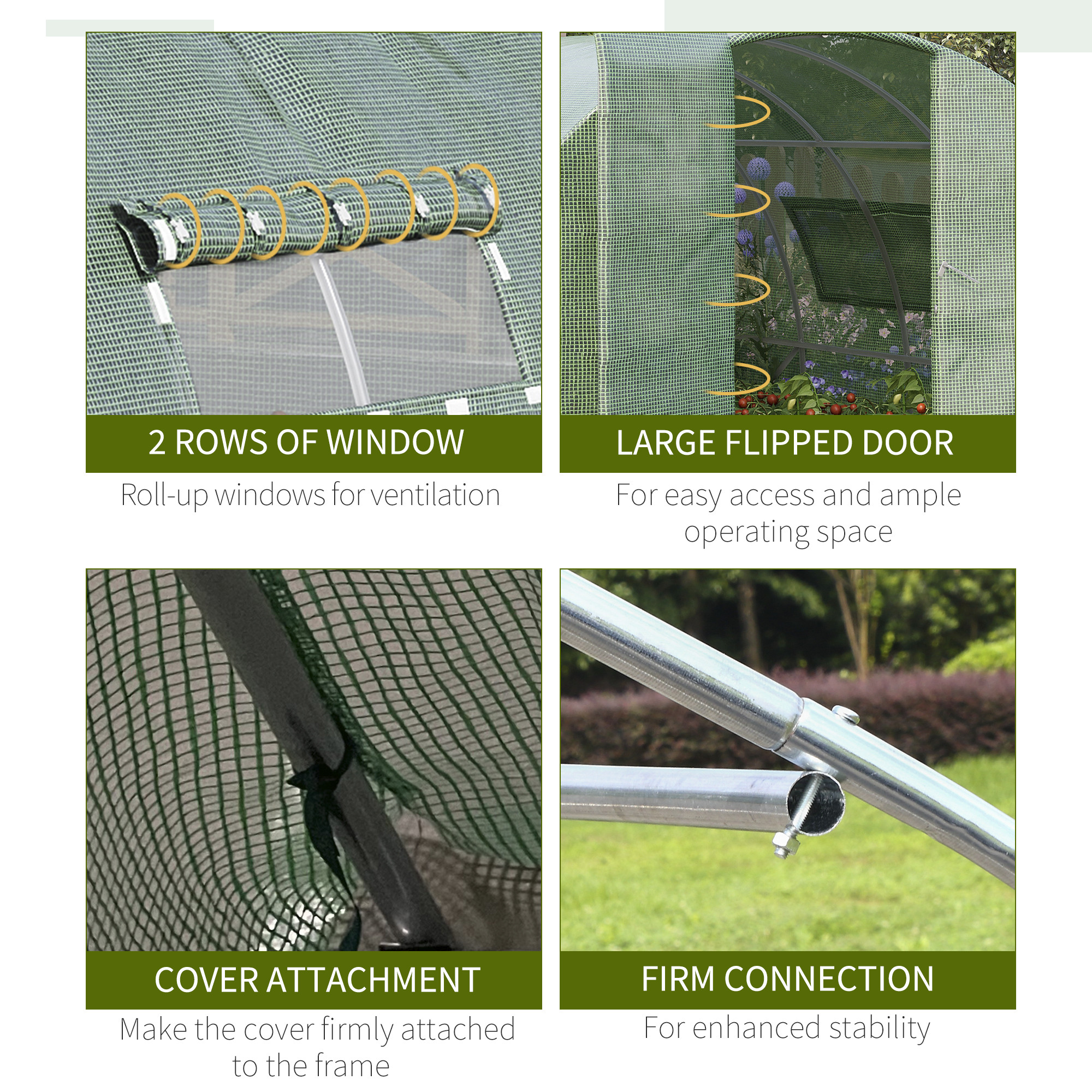 - DRAINAGE/CIRCULATION FUNCTION: 1 Large opening adjustable roll-up window on each side of the tunnel greenhouse for cross ventilation on hot days and drain away water and reduce pressure to the greenhouse outdoor frame