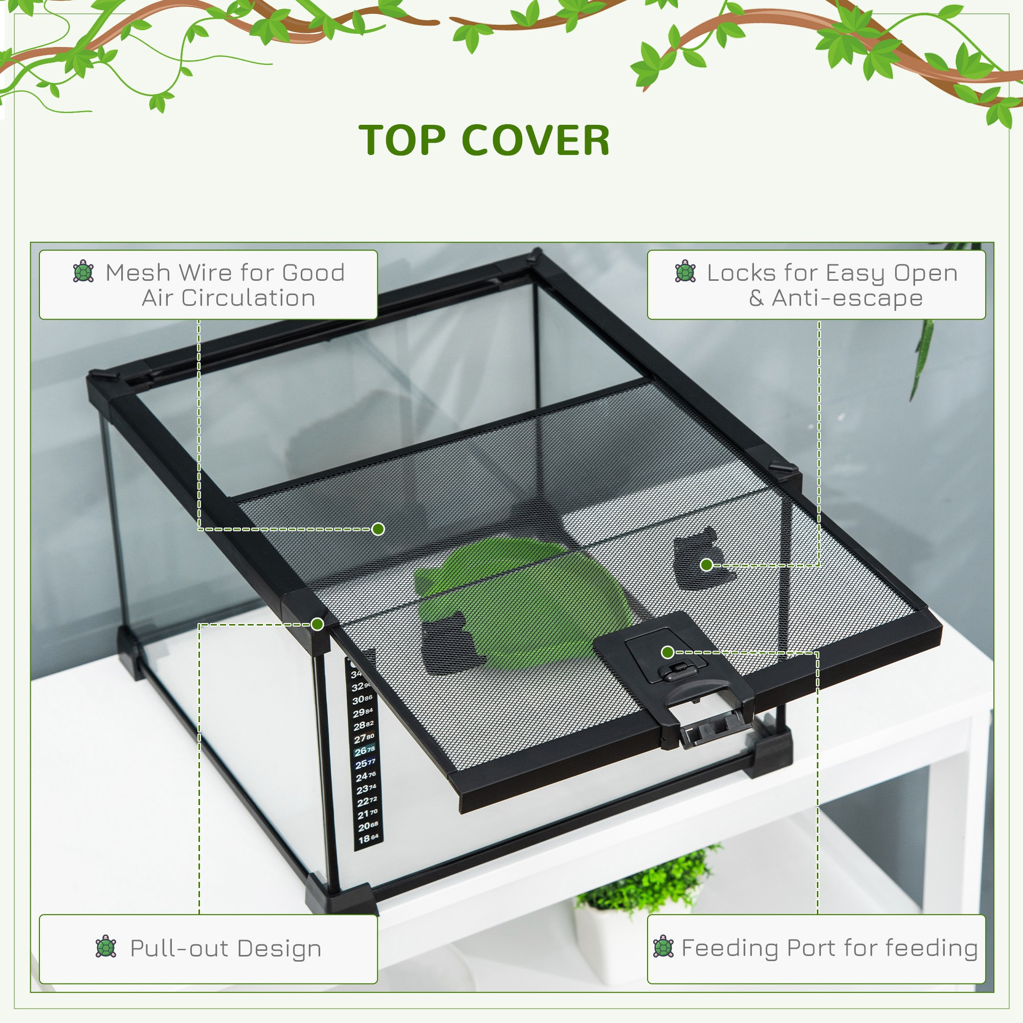 - AIR CIRCULATION: The top is made of wire mesh to provide adequate ventilation to meet the needs of the reptile keepers. The pull-out top cover includes a feeding port for easy feeding.