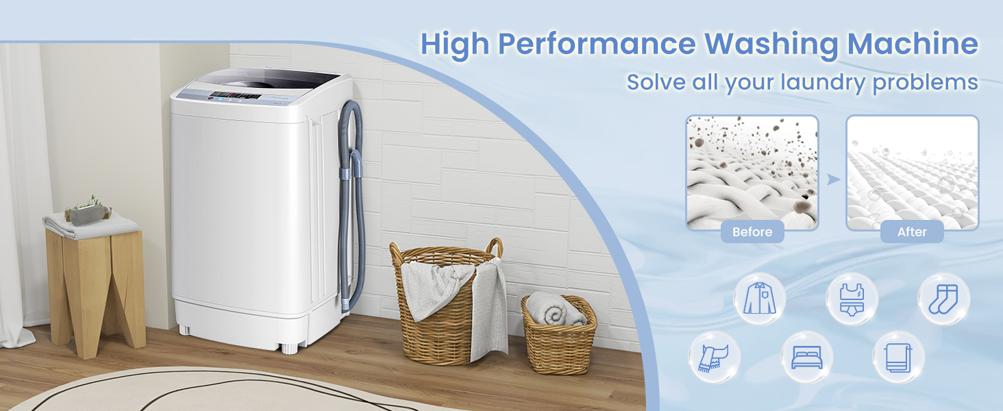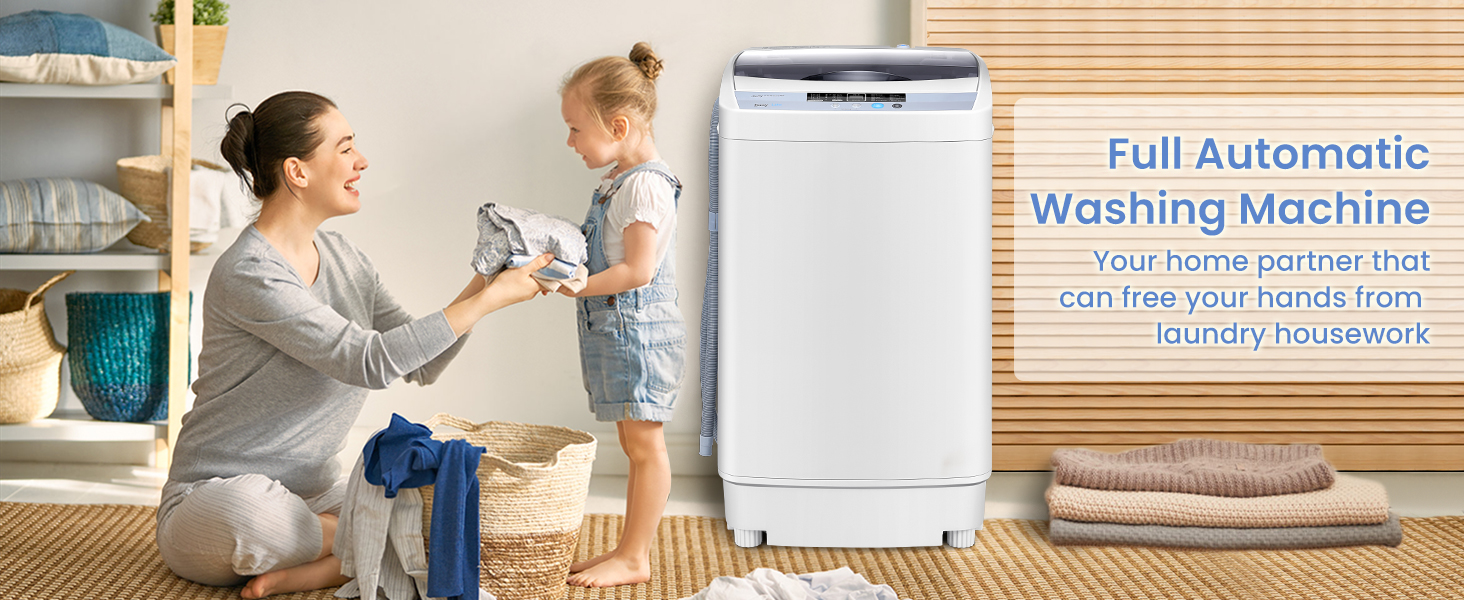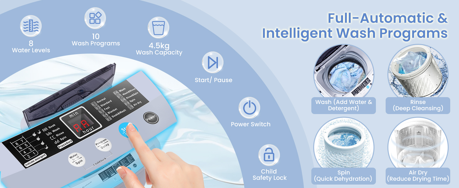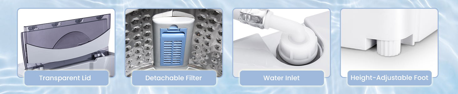 Safe Child Lock and User-Friendly Design: This compact laundry washer features a child lock function, avoiding accidentally using it to protect your kids. You can press the buttons of "water level/spin” and "program/delay” at the same time above 3 seconds to set the child lock. And the water inlet, drain hose and easy-to-clean filter make you use it easily.