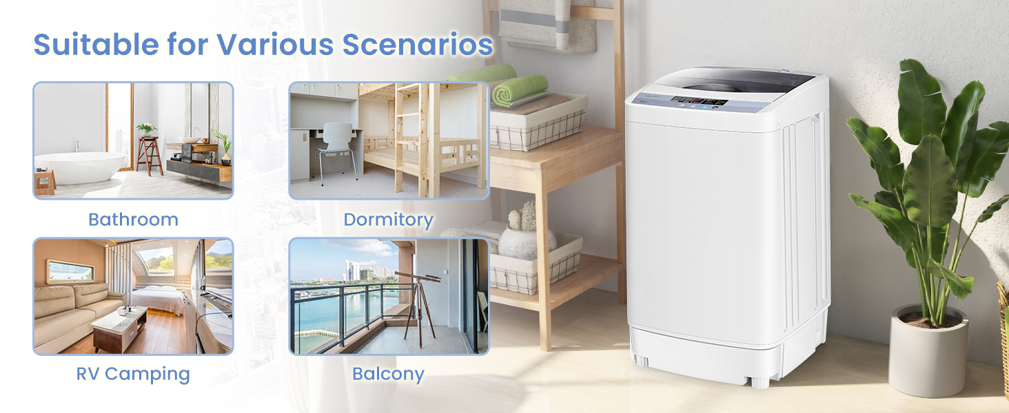Whether you live in an apartment, dorm, RV or home, this compact washer will not take up too much space. Meanwhile, its quiet operation avoids disturbing others during work. And the 4.5 kg, 8 water levels and 10 washing programs customize your washing needs. Thanks to its 2-in-1 design, this laundry washer can wash and spin your clothes, providing great convenience for you. Considering your kids’ safety, this portable washing machine is equipped with a child lock.