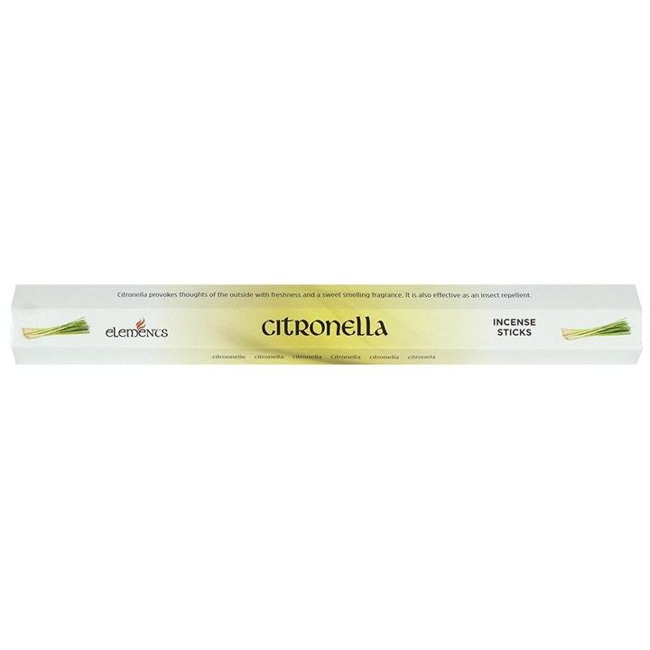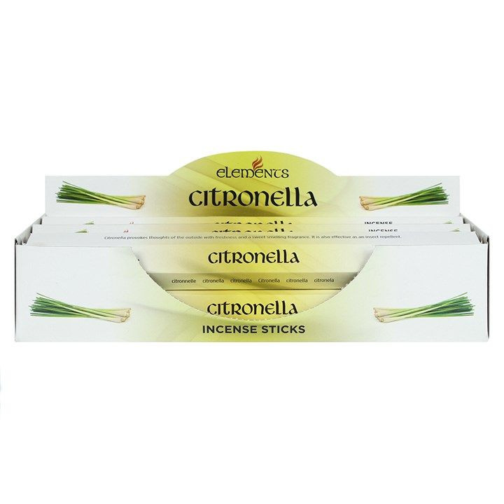 A box of 6 packs of Citronella fragranced incense sticks by Elements. Each pack contains 20 incense sticks. Product Dimensions: H2.5cm x W24cm x D3cm Packaged Dimensions: H5.5cm x W25cm x D9cm