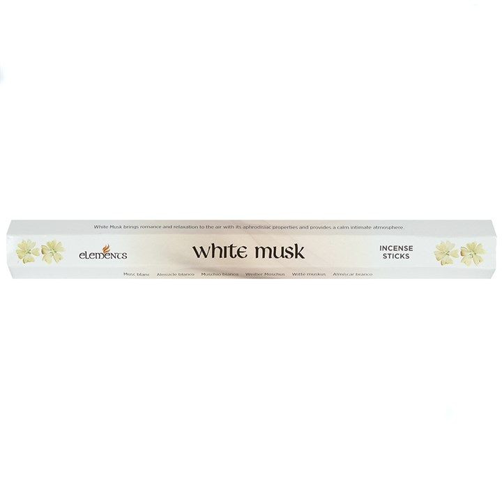 A box of 6 packs of White Musk fragranced incense sticks by Elements. Each pack contains 20 incense sticks. Product Dimensions: H2.5cm x W24cm x D3cm Packaged Dimensions: H5.5cm x W25cm x D9cm