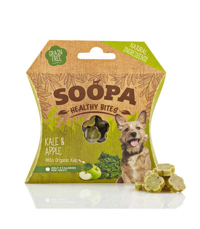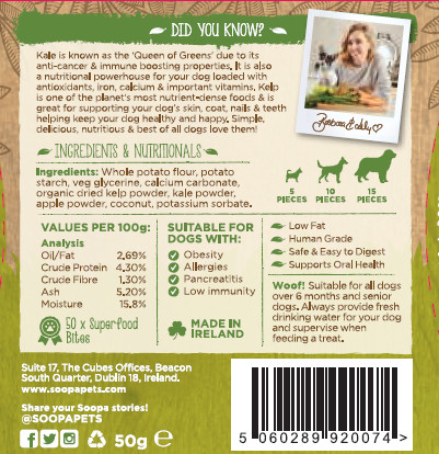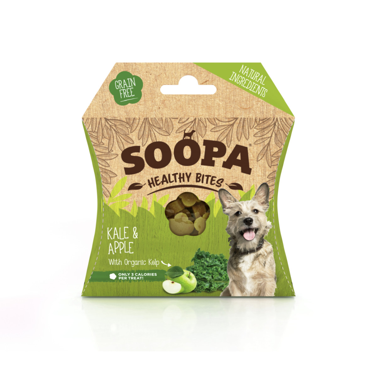 Soopa Healthy Bites dog treats are grain-free, hypoallergenic and made from natural human-grade ingredients. These small bite-sized pieces are excellent to use for training. They come in a handy pocket-friendly pillow pouch so you can use them on the go. Kale is known as the ‘Queen of Greens’ due to its anti-cancer and immune-boosting properties. Kale is also a nutritional powerhouse for your dog loaded with antioxidants, iron, calcium and important vitamins. Kelp is one of the planets most nutrient-dense foods and is great for supporting your dog’s skin, coat, nails and teeth helping keep your dog healthy and happy. Simple, delicious, nutritious and best of all dogs love them!
