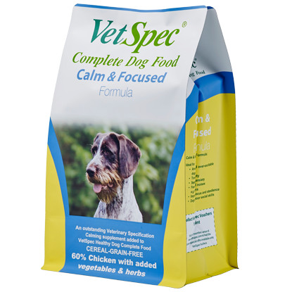 VetSpec Calm and Focused Formula is our very effective Calm and Focused Supplement and VetSpec Healthy Dog Adult Formula (see page 8) combined to make one unique Veterinary Specification, CEREAL-GRAIN-FREE Super Premium dog food. VetSpec Calm and Focused formula is ideal for all dogs that get anxious and overexcitable, suffer from separation anxiety or fear loud noises like fireworks. It is also very helpful when training young dogs to improve focus and obedience. Its formulation includes Tryptophan, Prebiotics and Magnesium