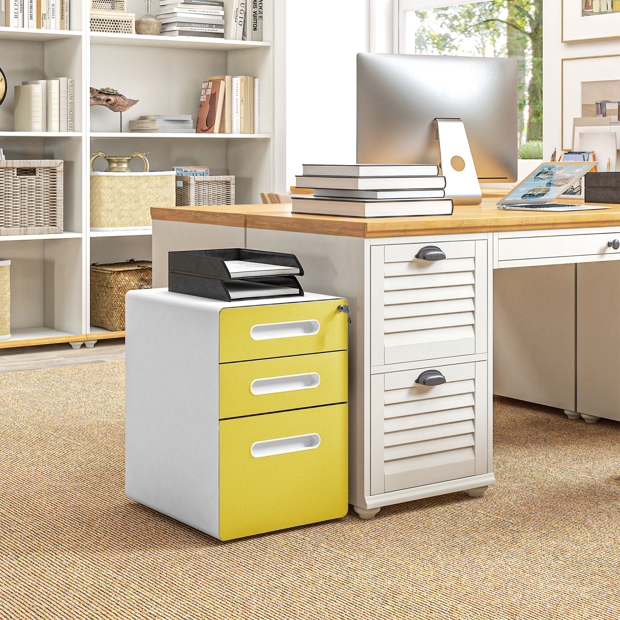 Vinsetto 3 Drawer Filing Cabinet, Steel Lockable File Cabinet with Lock and Wheels, for A4, Letter, Legal Sized Files, Yellow