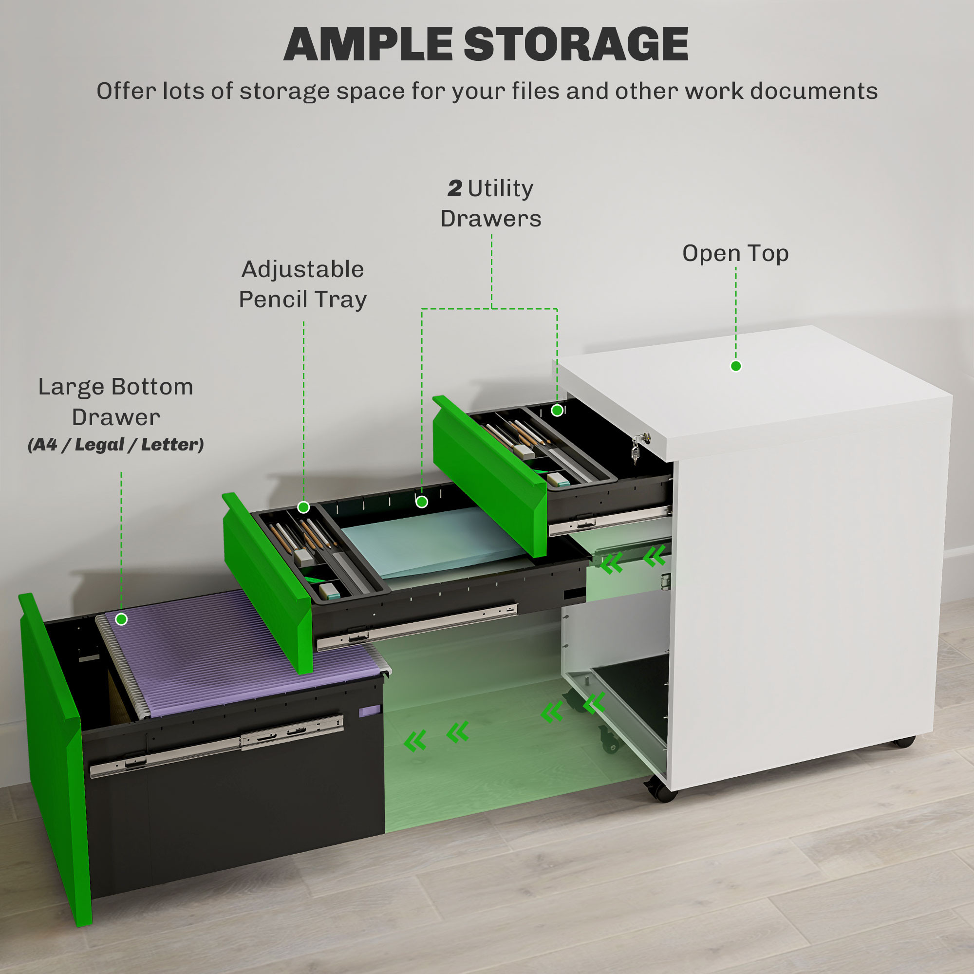 - THREE DRAWERS: Two small and a large, gives you lots of room for storing and organising your files. The top drawer comes with a stationery tray; bottom drawer features a rail for hanging A4, letter, legal files and folders.