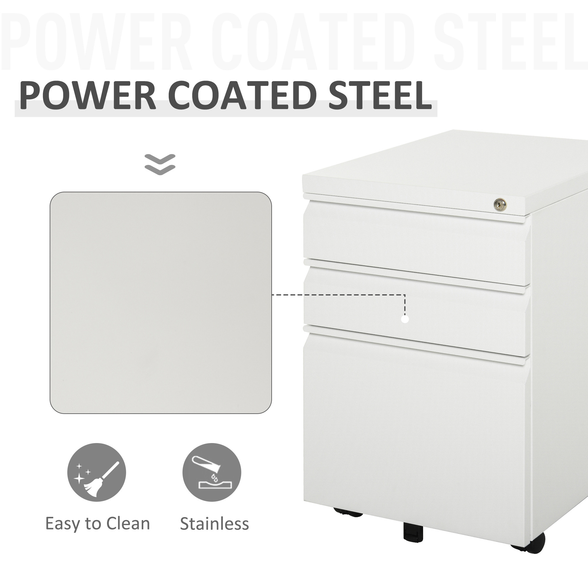 - STEEL BODY: A structure which is made to be used every day. Powder coated to ensure extra strength and protection. FIVE WHEELS: Keeps unit balanced and steady, even when the drawers are open. Two wheels are fitted with brakes.