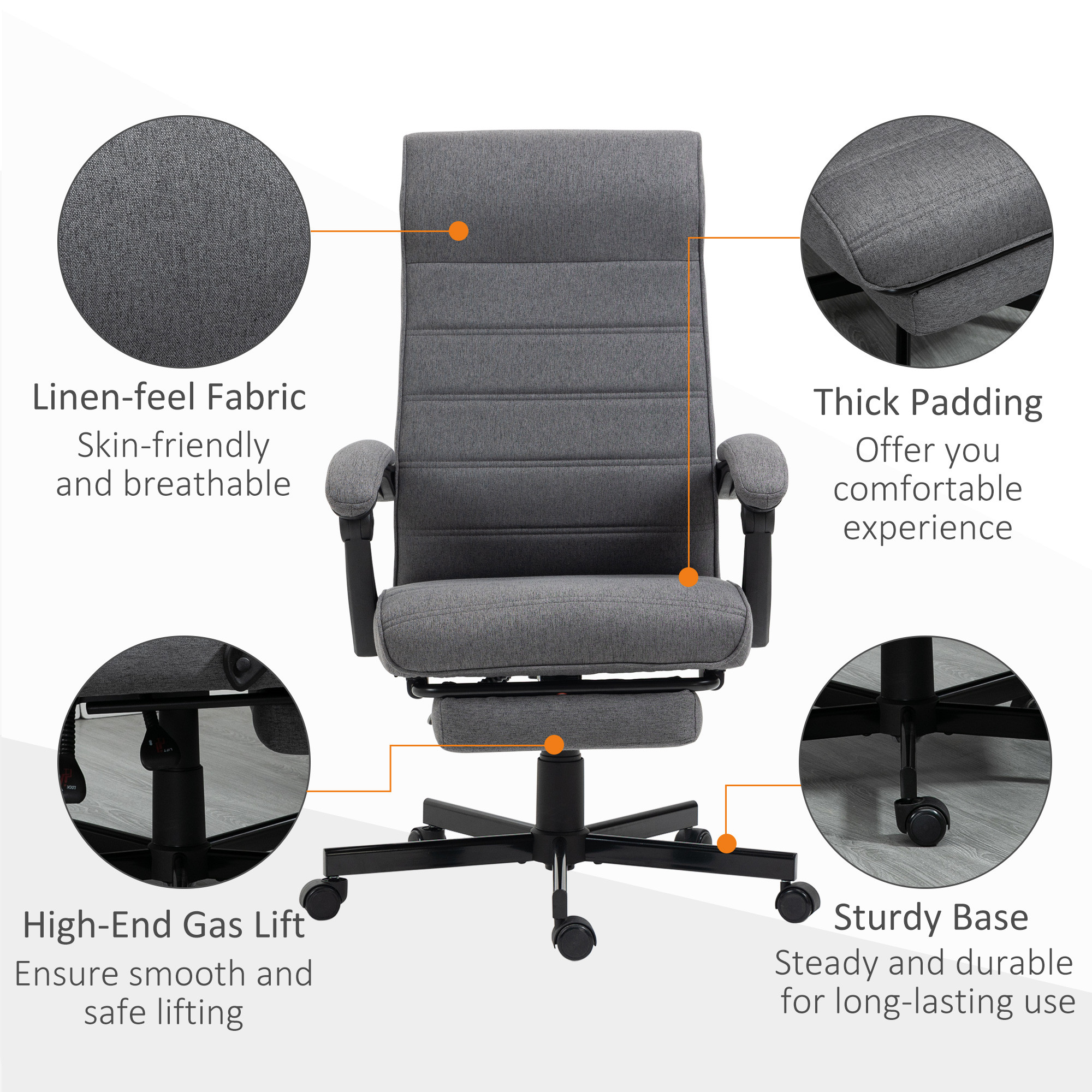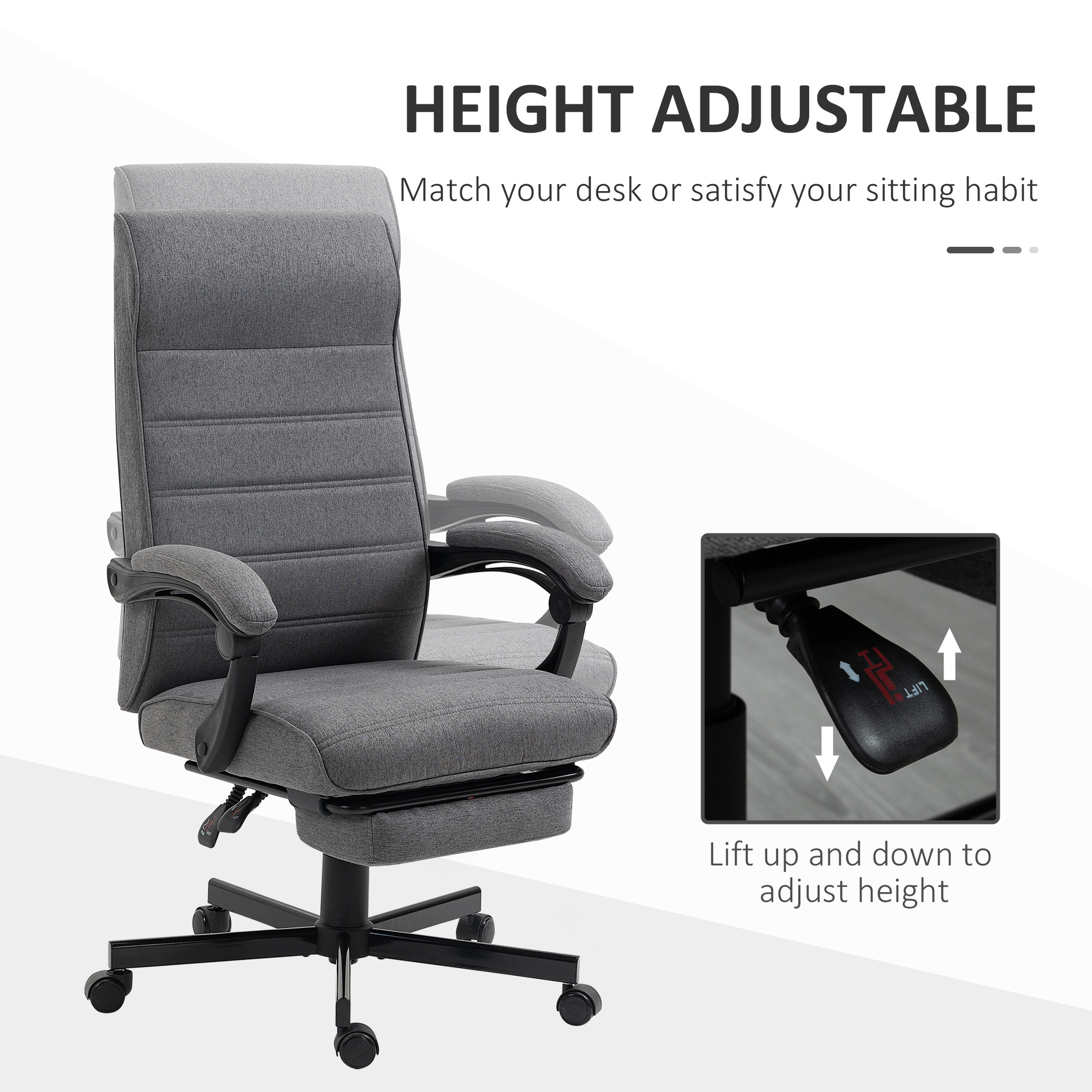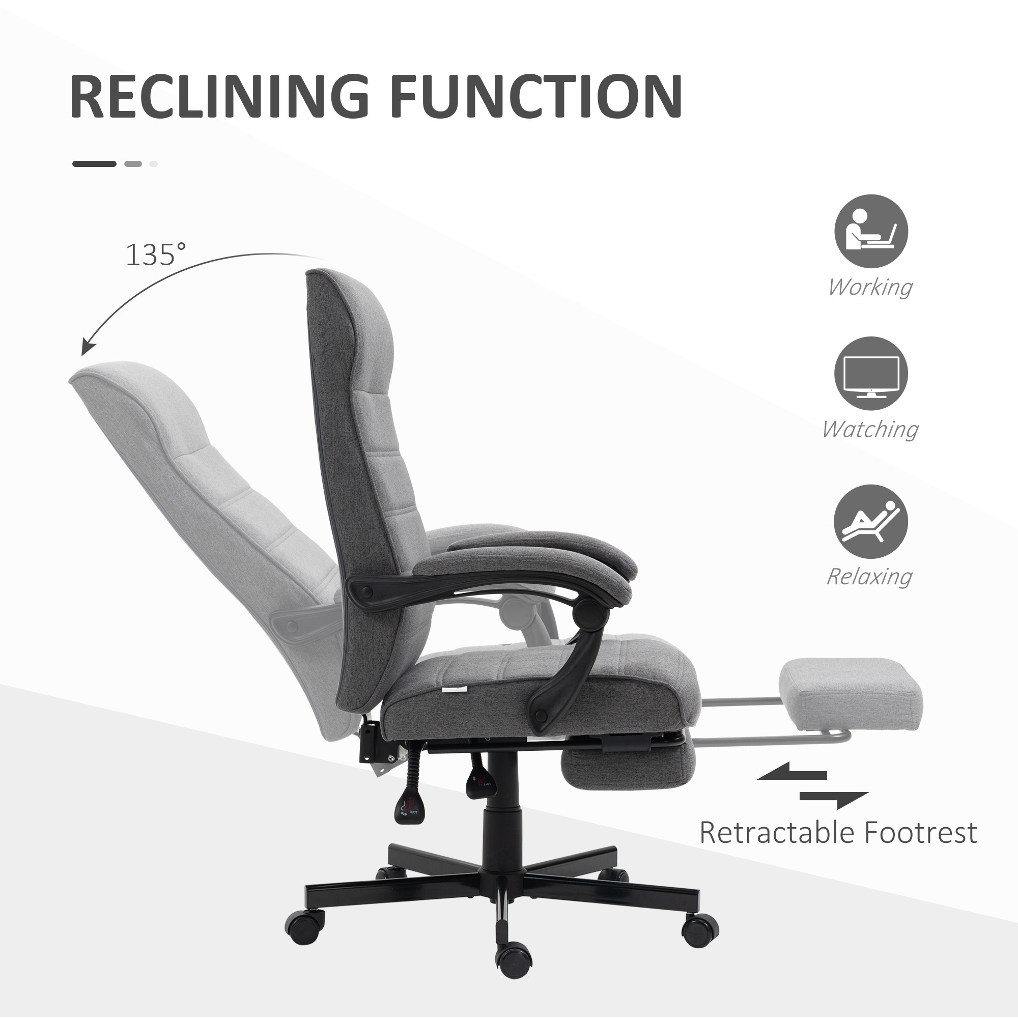 - Reclining, with footrest: Back on this high back office chair goes back to a maximum 135° angle. Great for lying back and taking time out. Manual footrest to elevate your lower body. An office chair for home, an office chair for work.