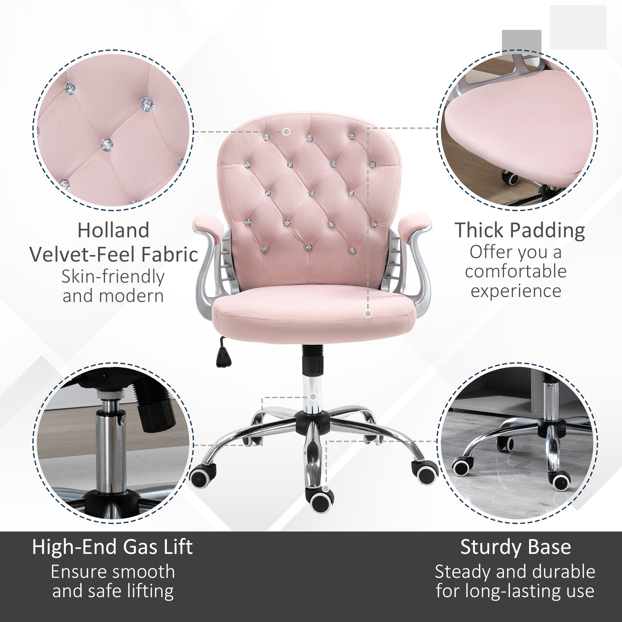 - Glam Design: Softly-coloured home office chair features an abundance of diamantes on the tufted back. Add some sparkle and fun to your work time.