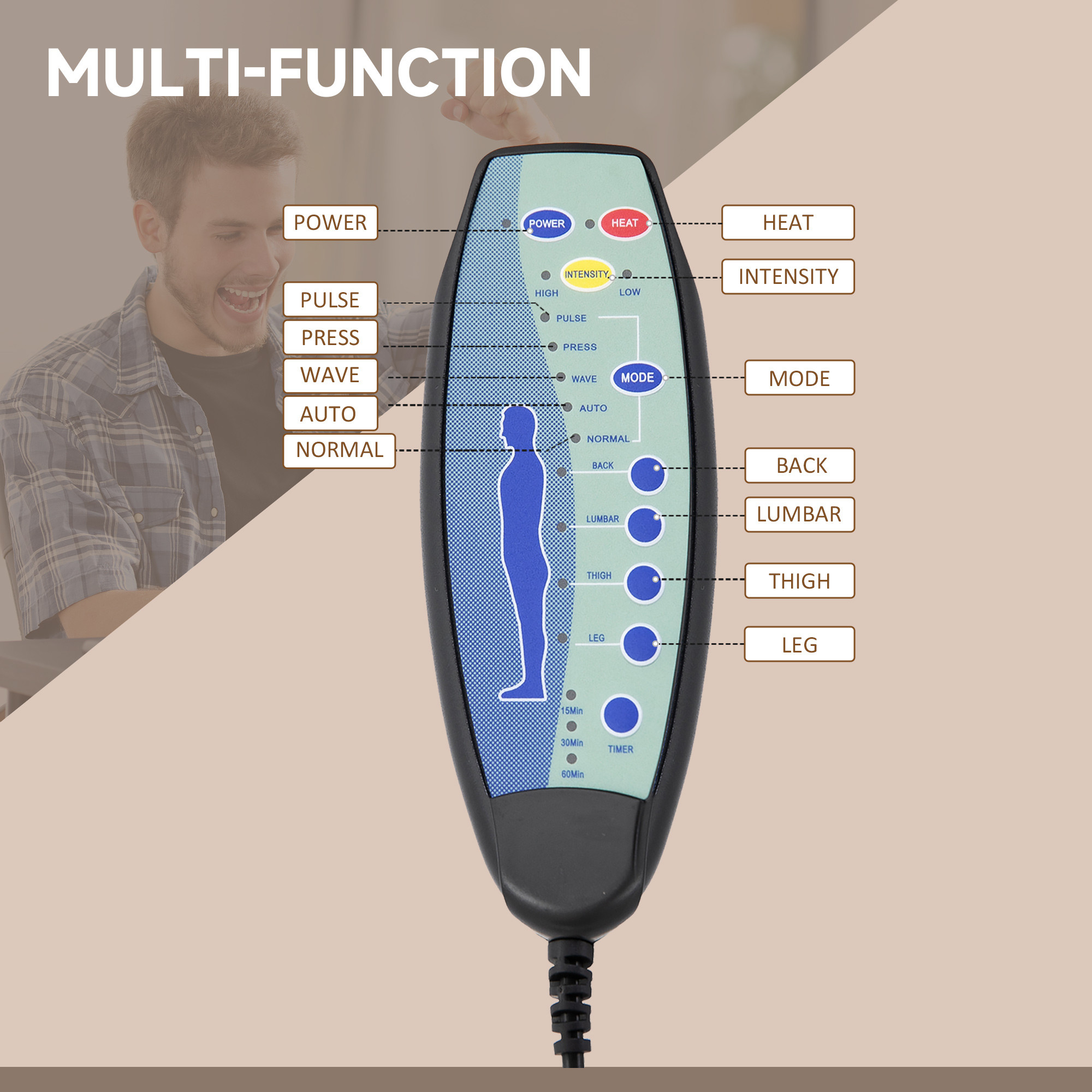 - Microfibre upholstery: Soft and smooth to the touch, this office massage chair can be wiped clean for ease. Padded all over for comfort.
