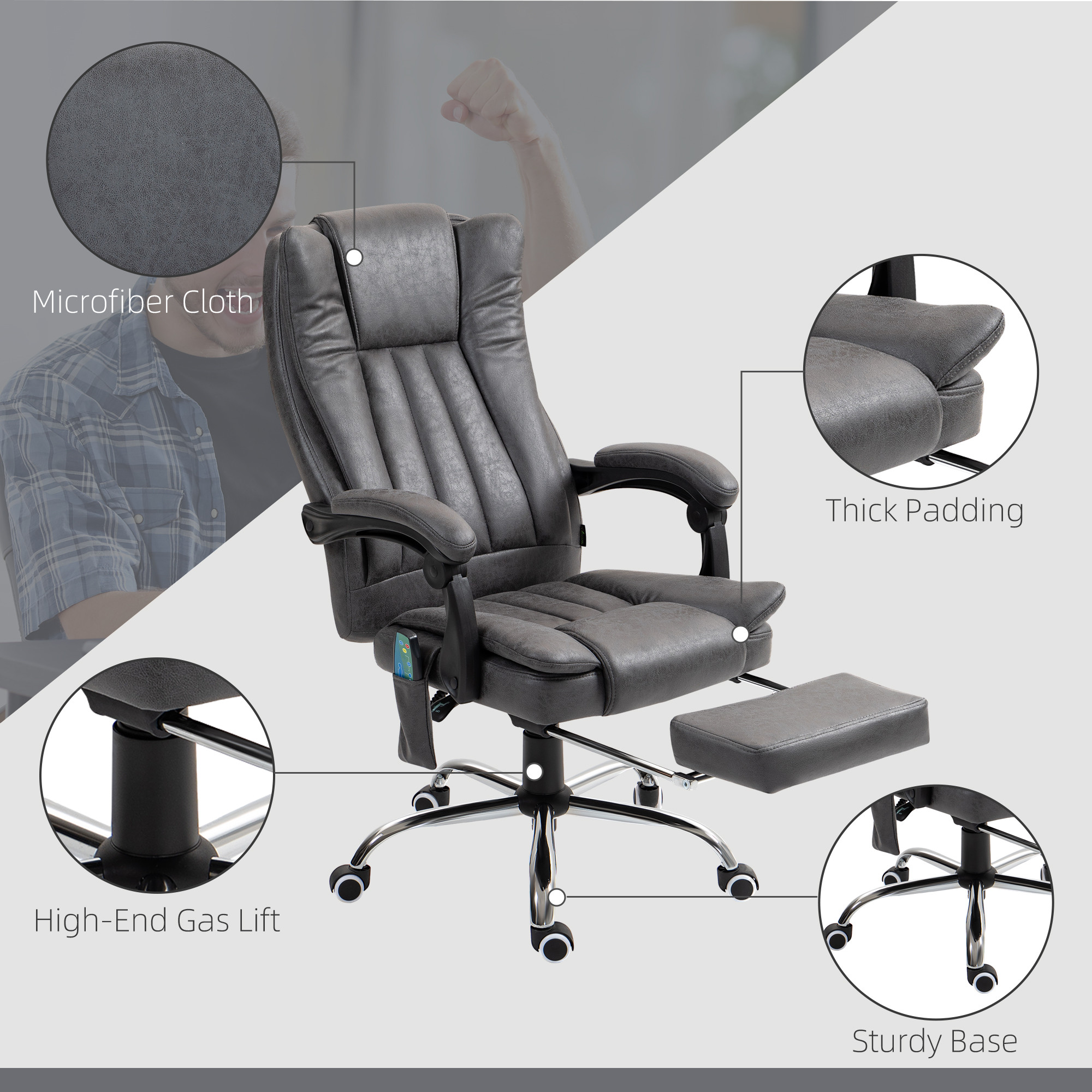 - Six massage points, with heating function: Placed on the back, lower back and thighs for all-over comfort and relaxation. This high back office chair is controlled by the included remote.