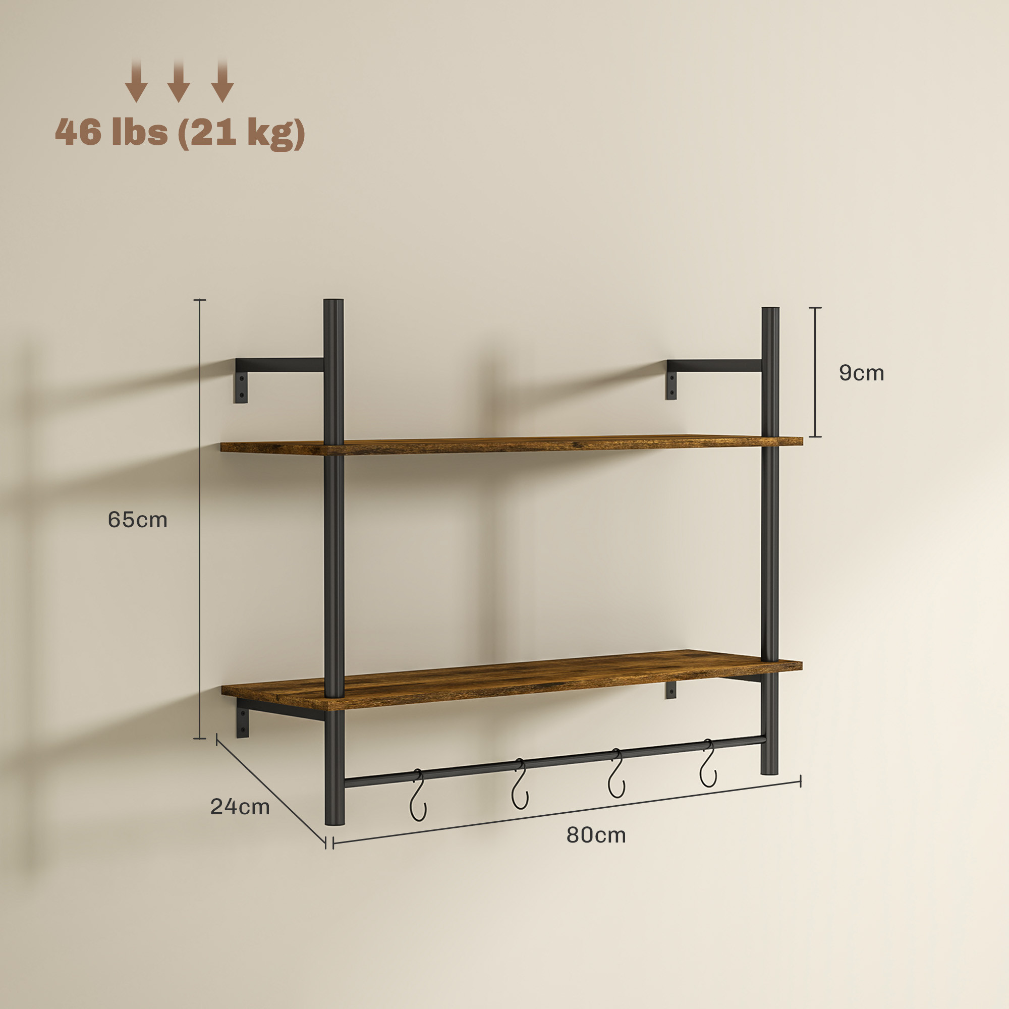 Wall Mounted Floating Shelves with 4 Hooks, Rustic Wall Shelf Unit for Living Room, Entryway, Rustic Brown