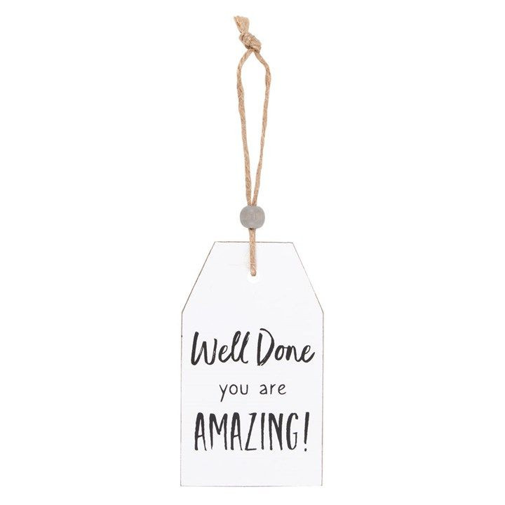 The perfect token gift for family and friends, this white sentiment wooden tag-shaped decoration features the words 'Well done. You are amazing!'. Approximately 8cm in height with twine hanger and finished with a wooden bead.