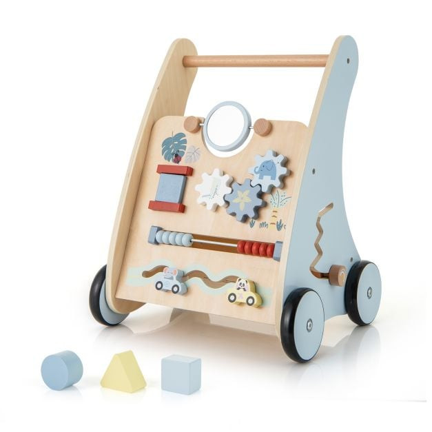 This charming walker is a treasure trove of engaging gadgets like a fun maze, rotatory gears, and a shapes sorter, all designed to enhance motor skills, hand-eye coordination, and creativity. With a sturdy and wide-based structure and a safe and smooth wood handle, it’s safe for kids to learn walking. Plus, the back storage compartment can keep toys and essentials within reach for more fun. Step into a world of giggles and growth with this reliable and all-round developmental walker, which will be an ideal gift for your little explorer.