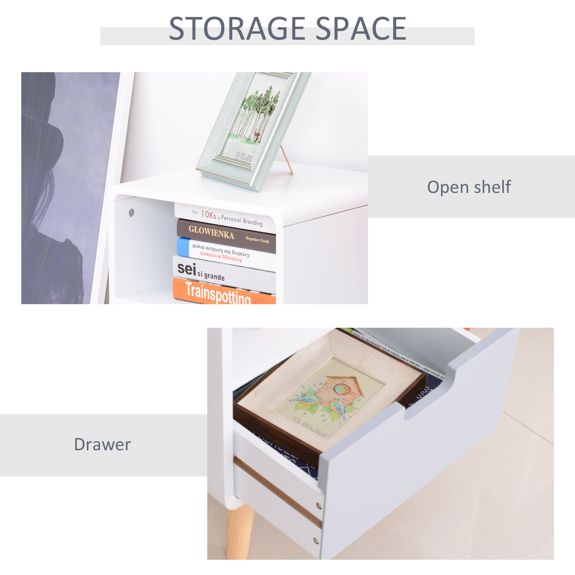 - Lots of storage: Features a small open shelf and a grey lower drawer and a sleek top surface. Ideal for plants, ornaments or reading lamp. The hollow drawer handle adds a unique touch.