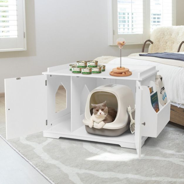 The large cat litter box enclosure measures 34" x 21.5" x 20.5"(L x W x H) and the interior can load up to 66lbs, providing large space for accommodating most litter boxes. It can not only provide a safe enclosed place for your lovely cat to have private time but also tray odours and cat litter, maintaining a tasteful and tidy living space. The large tabletop and side storage racks can also satisfy your displaying and storing needs. Besides, there exists an adjustable and removable divider, which allows you to change the inner layout to create extra space for storing cat litter, shovels, or other cat supplies. More than that, with the modern and stylish appearance, the decorative cat furniture hidden cabinet can also be a perfect addition to your living room, bedroom, bathroom, entryway, and more. If you are looking for a large cat litter box enclosure like this, do not hesitate to place an order!
