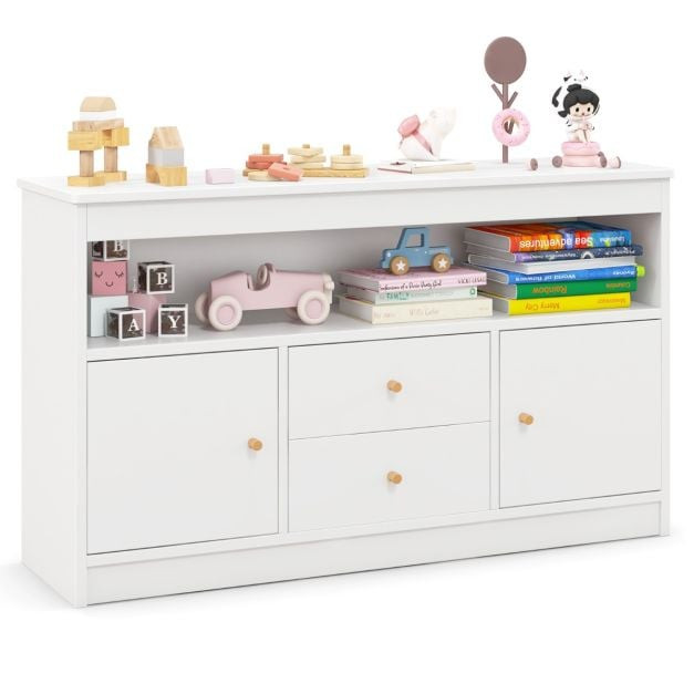 compartment to place frequently used items, such as books and toys. Below it are 2 drawers for storing smaller accessories and 2 single-door cabinets for larger items. Each section can accommodate a variety of items, helping keep your child’s playroom or bedroom clutter-free. This toy organizer can also be used as a bookshelf, display cabinet and storage cabinet, suitable for the living room, study, bedroom, nursery, kindergarten, etc. Equipped with 2 anti-toppling devices and round corners, this wooden storage chest is a safe addition to any child's space. Constructed from high-quality materials, the cabinet is designed to withstand daily wear.