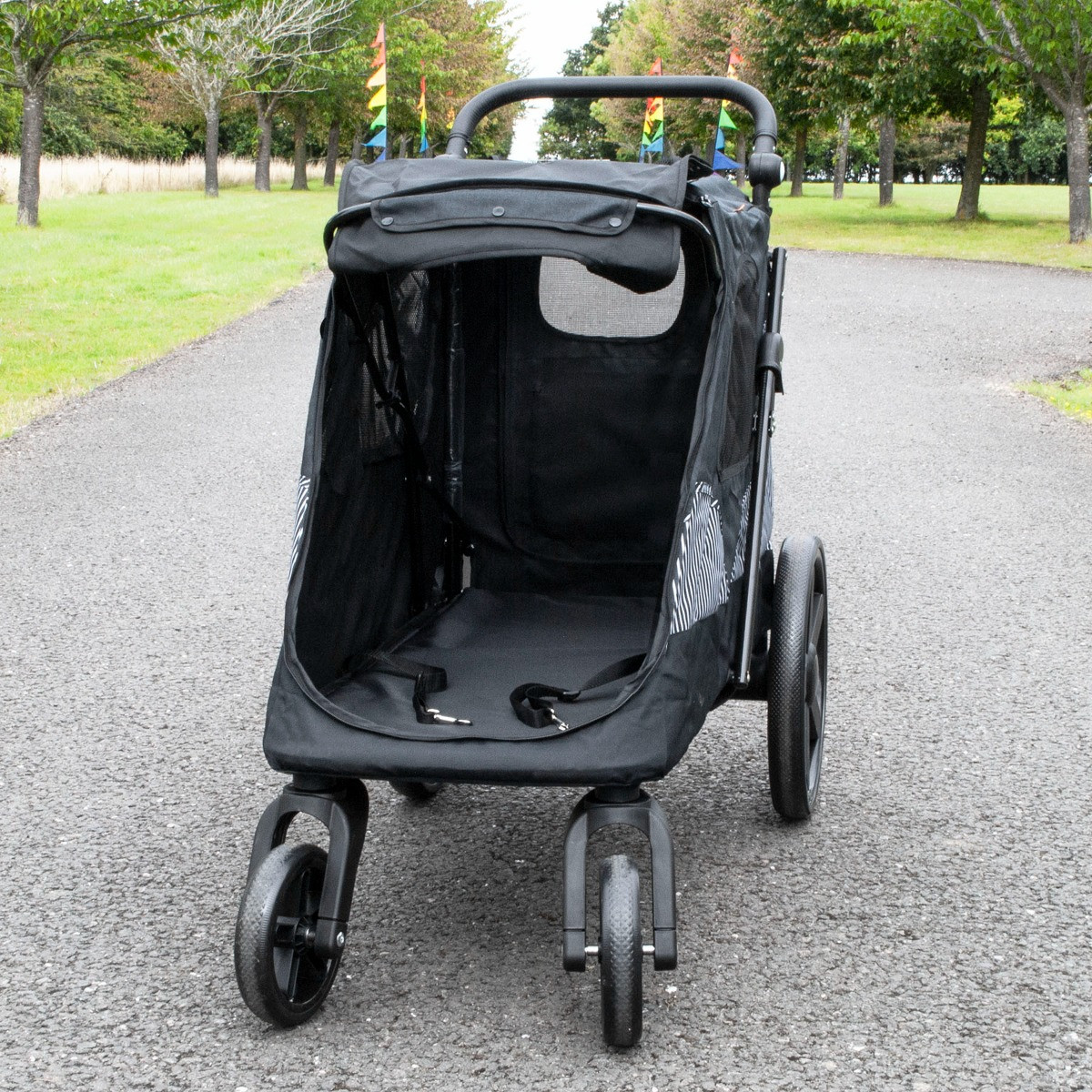 <p>The pet stroller is large enough for a varietyof pets, with a pair of collar clips inside for safety. The pram itself has multiple mesh panels for ventilation and visibility, and these panels can also be unzipped to really open up the view! There is a foot brake on the rear wheels, allowing you to lock the stroller in place when needed. The stroller can also be folded down when not in use and the wheels can be removed by the touch of a button.</p>