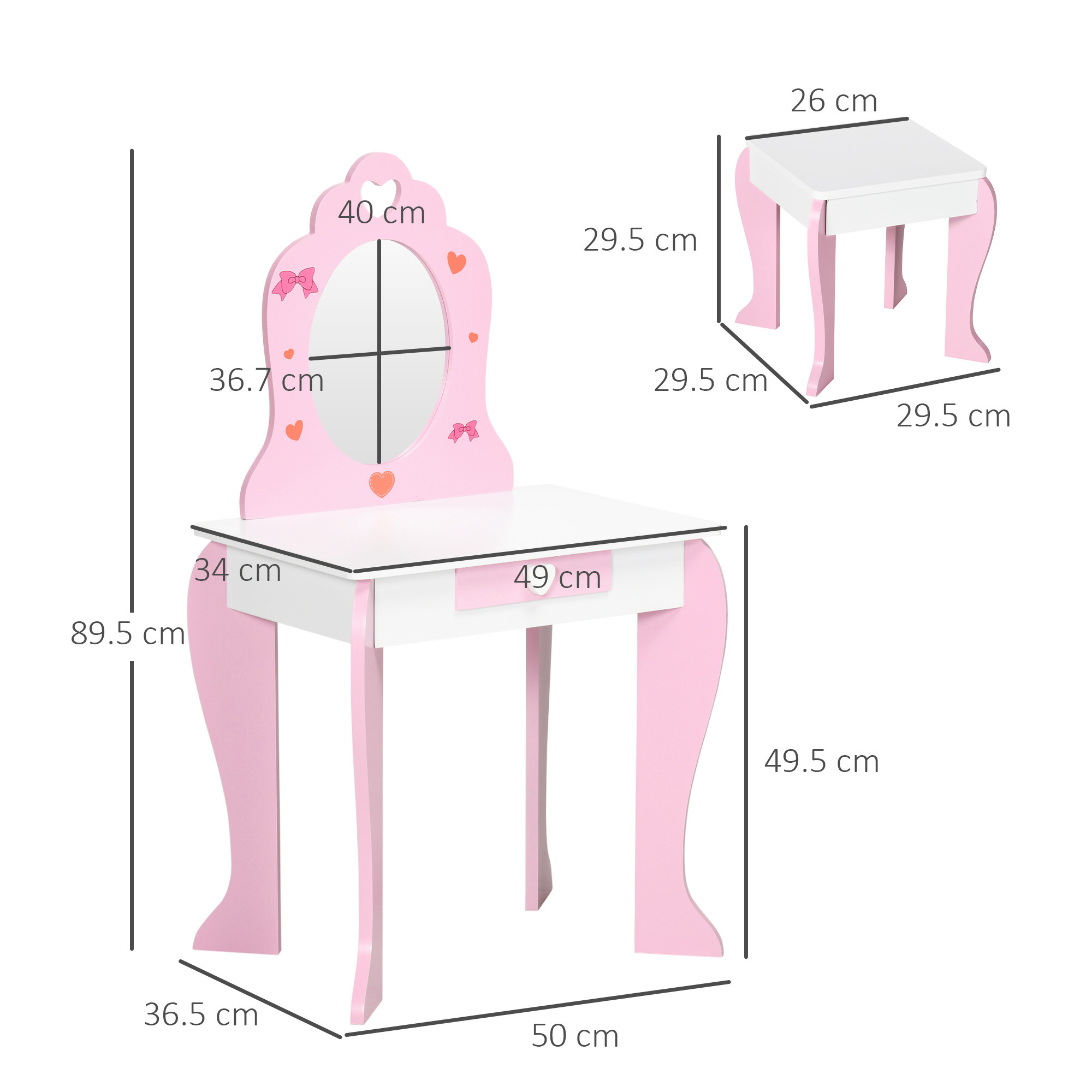 ZONEKIZ Kids Dressing table Set w/ Mirror, Stool, Drawer, Cute Patterns, for Ages 3-6 Years - Pink