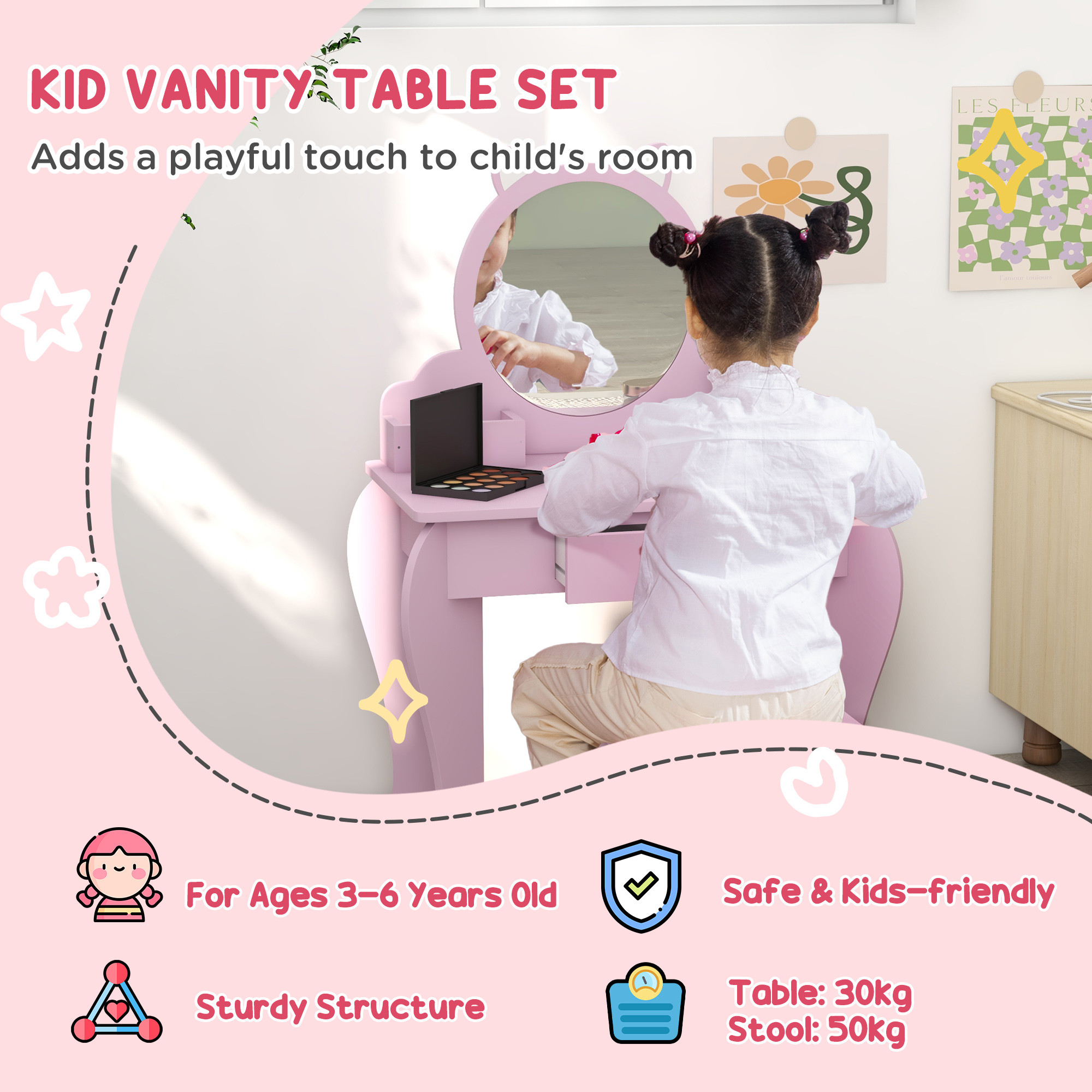 - Safe and stylish: A cute cat-shaped mirror, its all-pink design uplifts any space. Crafted with MDF, this kids vanity table set is safe and robust – suitable for daily use. The mirror is made of acrylic, so it won't break into sharp pieces.