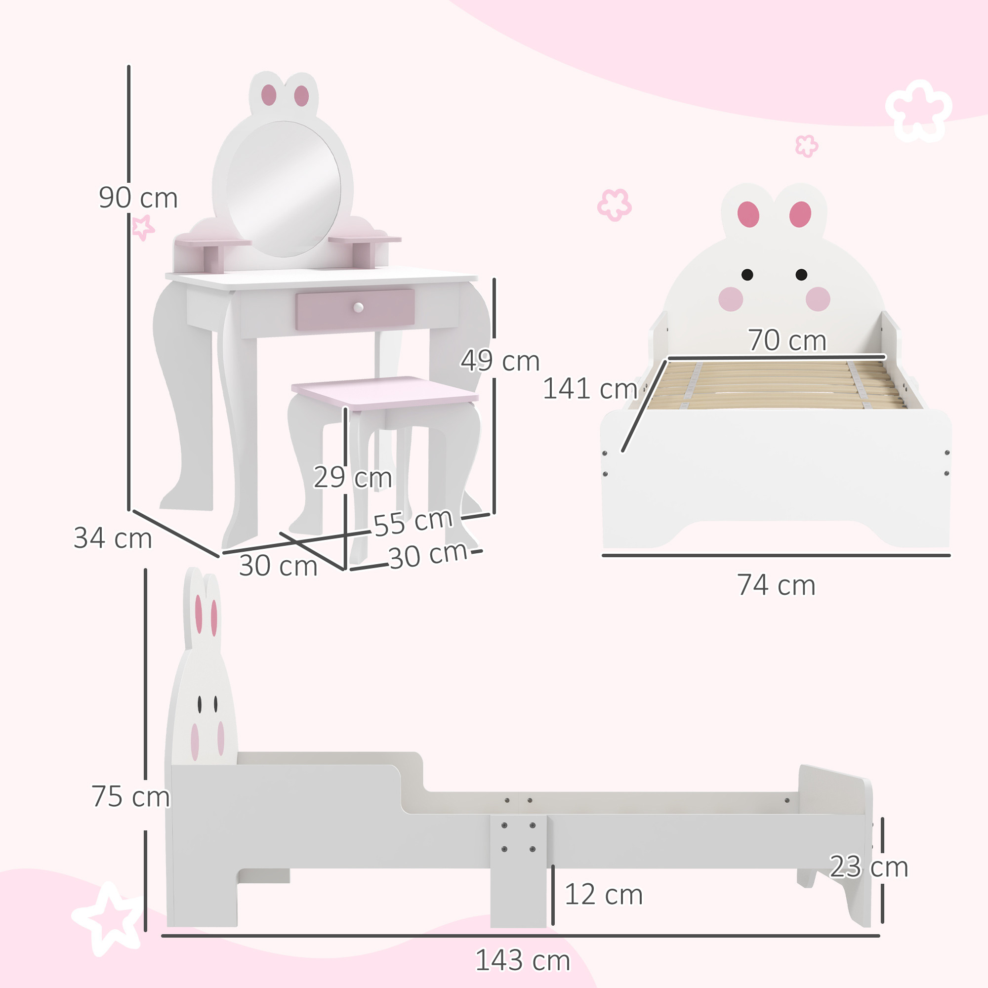 - Dimensions: Table: 90.5H x 55L x 34Wcm. Table height: 49cm. Chair: 30H x 29L x 29Wcm. Bed: 75H x 143L x 74Wcm. Suitable mattress size (not included): 5-10H x 140L x 70Wcm. Qualification age: 3+ years. Recommended age: 3-6 years. Maximum weight capacity: 80kg (Bed). 30kg (Table). 50kg (Stool). Assembly required.